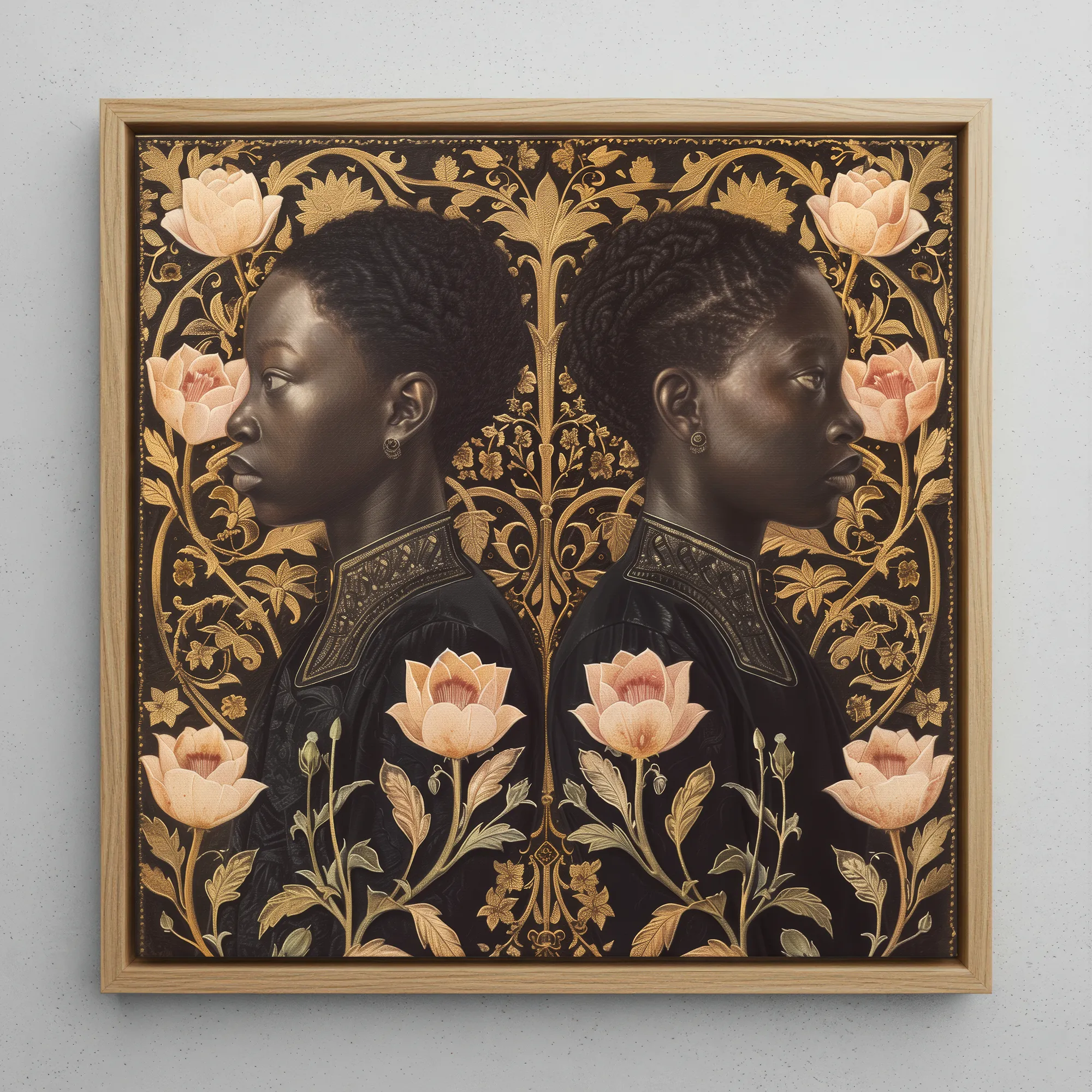 Reflejadas pero distintas, las gemelas se alzan contra un tapiz de anhelos dorados. Lizzie & Carlotta—centinelas del tiempo, su piel de obsidiana besada por la suave rebeldía de las flores en flor. Un filigrana dorada oscura se despliega en sus hombros. Flores rosa pálido las rodean contra un negro medianoche. Susurran de resiliencia, renacimiento y algo no dicho—una historia que se dobla pero nunca se rompe.