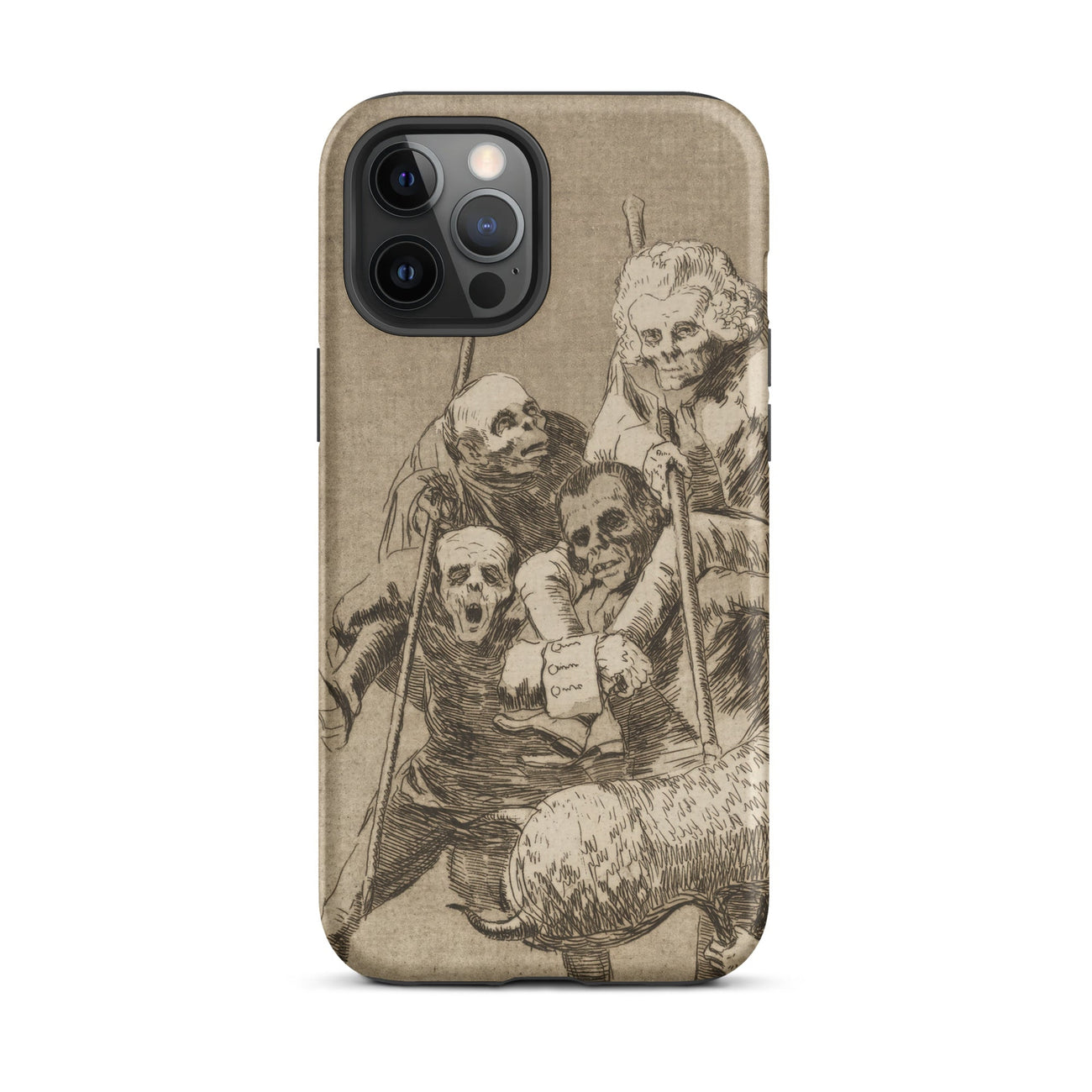 Lo que uno hace a otro de Goya escenifica una comedia sombría de cuerpos enredados en esta funda de iPhone. Las figuras, demacradas y con aspecto de máscara, se agrupan en una solidaridad grotesca, sus bastones y brazos entrelazados los unen en un teatro de explotación.