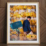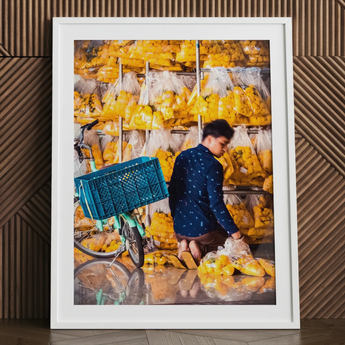 Estallidos de azafrán explotan en este mercado de flores de Bangkok impresión artística, transportándote al núcleo palpitante de Pak Khlong Talat. Los crisantemos caen en un diluvio dorado, su tesoro envuelto en gasa se extiende interminablemente hacia el cielo. Una figura solitaria, vestida de azul medianoche, se arrodilla en medio de este tsunami floral, sus manos ágiles orquestando la sinfonía efímera de la naturaleza.