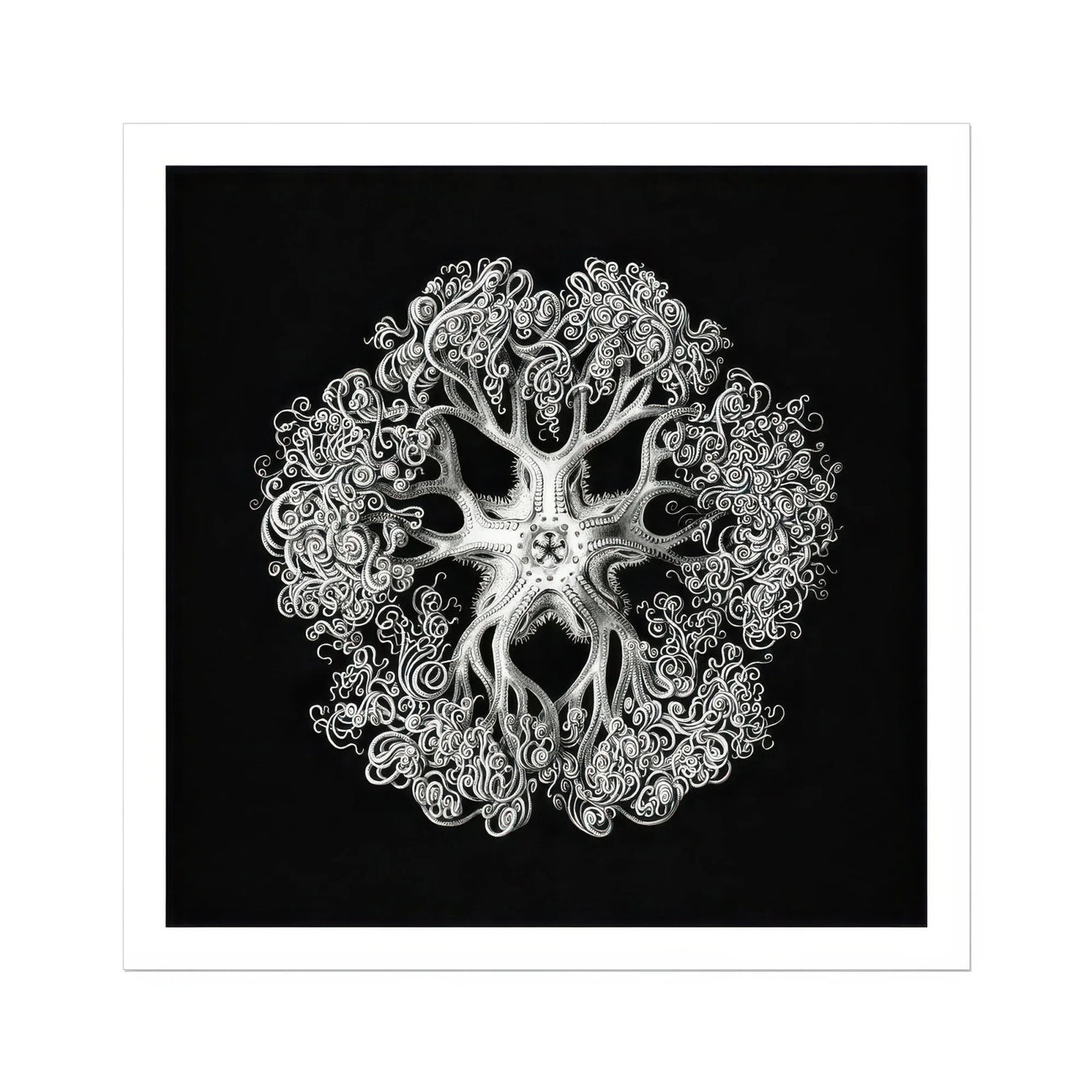 Descubrirás profundidades ocultas en esta hipnotizante obra de arte de ofiuroideo. La maravilla monocromática de Haeckel transforma una humilde estrella frágil en un mandala cósmico. Su disco central irradia cinco brazos ondulantes, cada uno un país de las maravillas fractal de rizos y espirales. Esta litografía eleva las minucias marinas a una grandeza celestial.