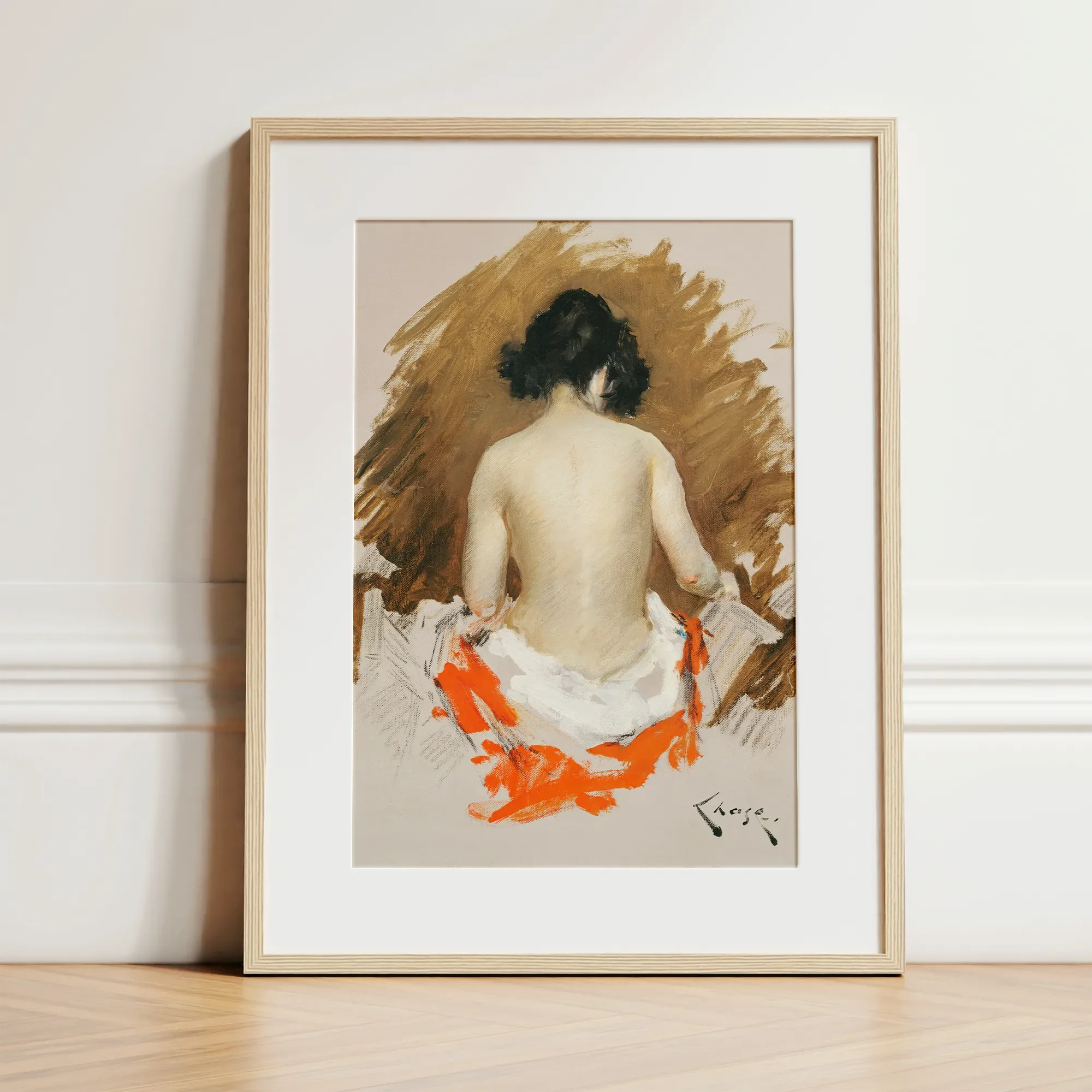 Sumérjase en la audaz exploración de la forma y el color de William Merritt Chase con este cautivador estampado de arte. La piel pálida de una figura desnuda contrasta dramáticamente con un telervelo de ocre y naranja ardiente, invitando a tu mirada a quedarse en cada pincelada. La técnica magistral de Chase trae el sujeto a la vida, su espalda dio una pose atractiva que dice mucho sin revelar todo.