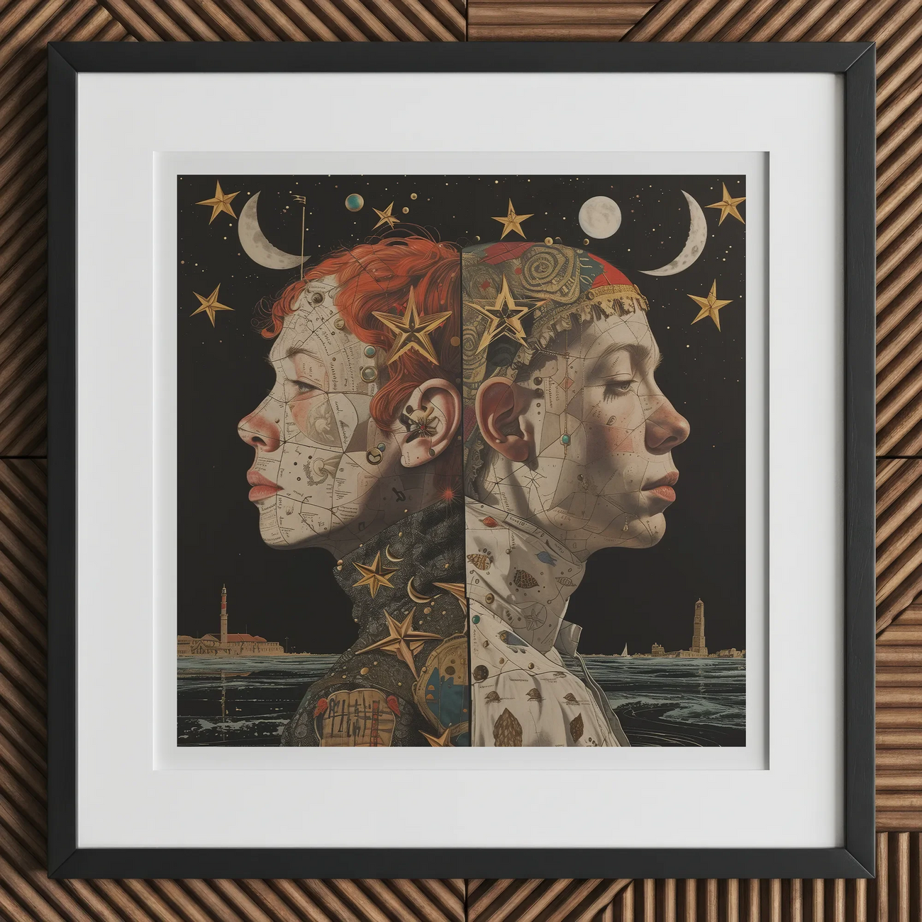 Una ciudad flotante se cierne en la distancia, sus agujas fantasmas contra la marea, una tierra de secretos donde el amor prohibido una vez prosperó. Arte lesbiano surrealista se encuentra con la mitología celestial, donde el universo mismo traza los contornos del deseo. Su piel, un pergamino de mundos olvidados, sus expresiones—un anhelo escrito en constelaciones. ¿Son amantes, hermanas, o ecos de la misma alma dividida entre el pasado y el presente?
