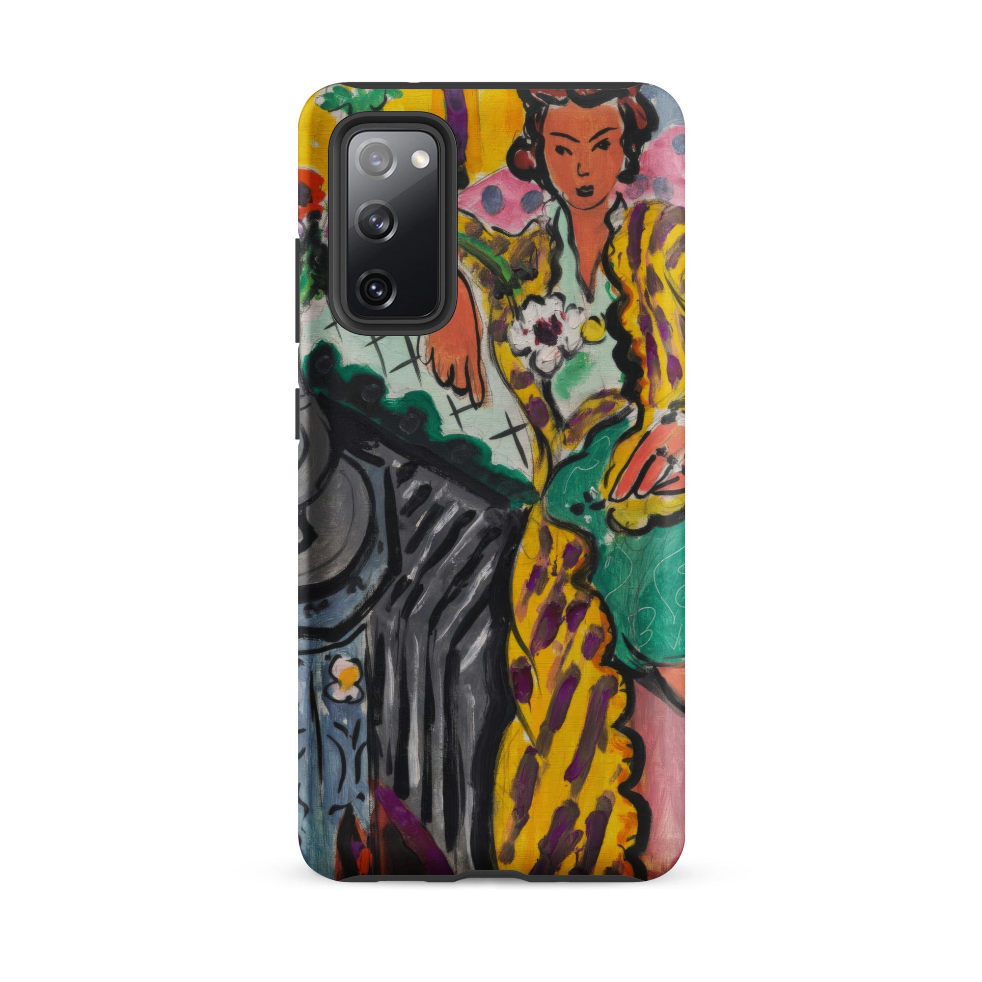 Pintado en 1937, Odalisca Amarilla late con la inmediatez fauvista: amarillos cadmio, curvas de verde viridiano, nubes rosa-rosadas, todo cambiando contra contornos de tinta negra. La funda de Samsung traduce ese calor de estudio en una armadura del tamaño de la palma de la mano: pigmento de archivo sellando su postura, su mirada, su geometría del ocio.