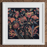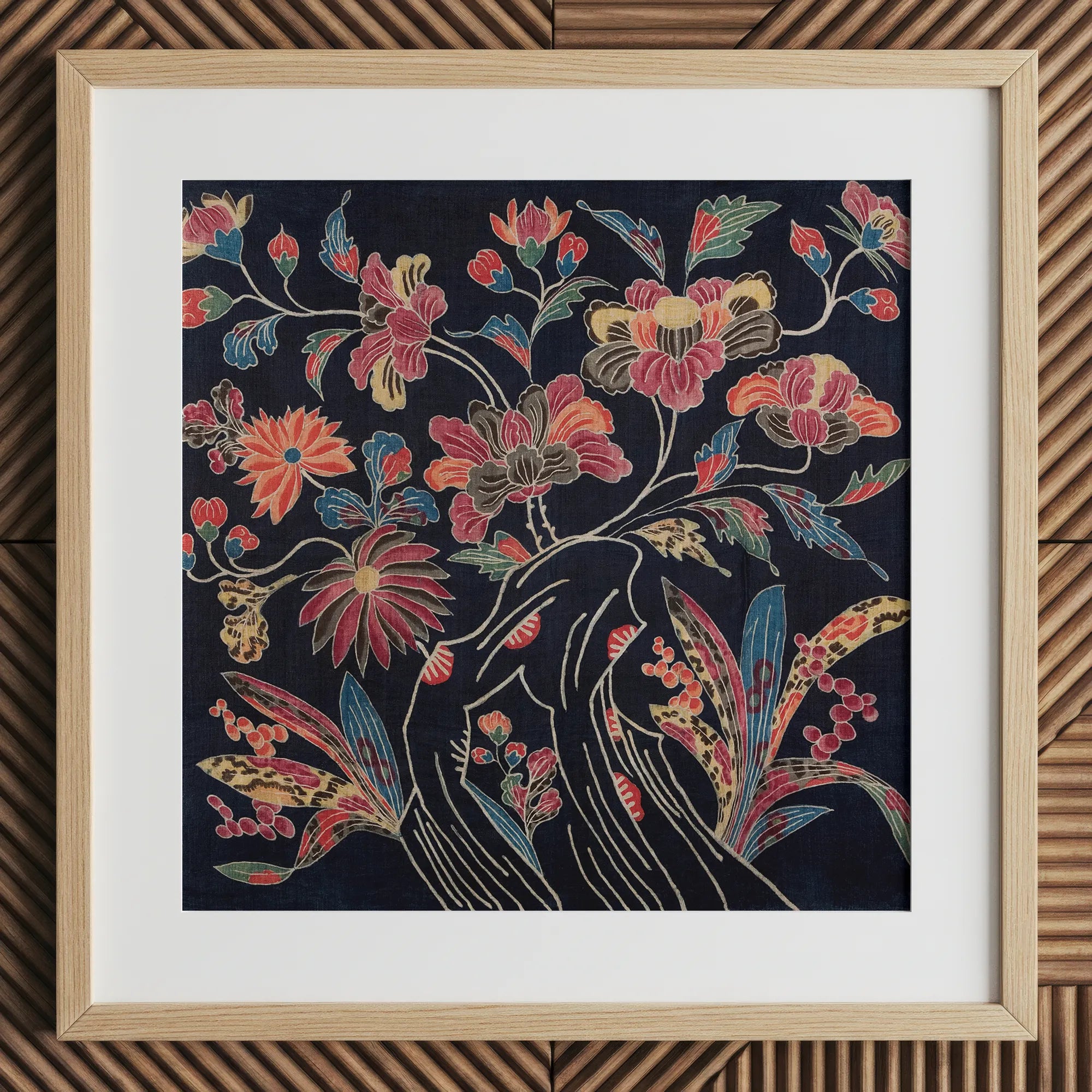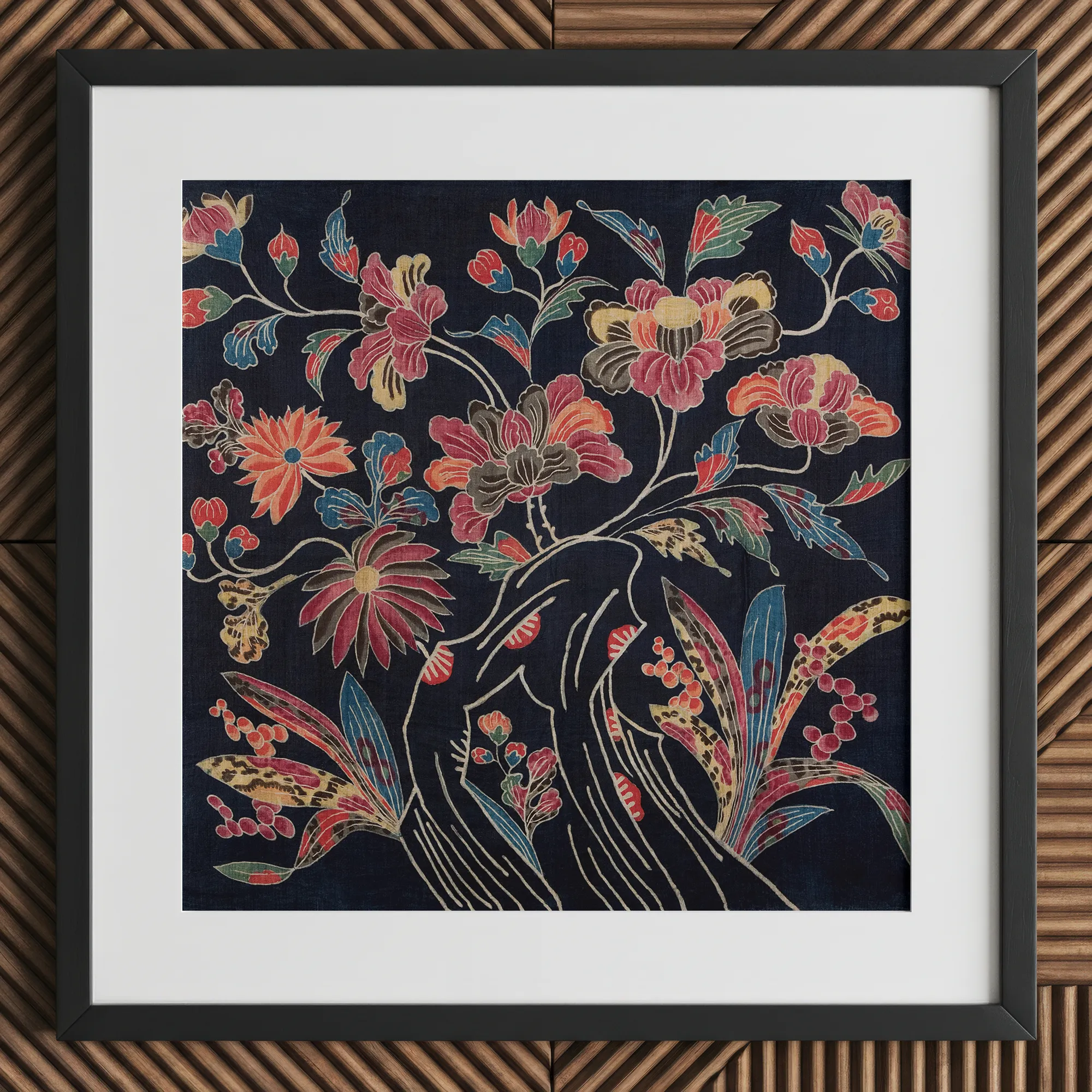 Contra un rico fondo textil japonés negro, los tonos vibrantes estallaron en una sinfonía circular de flora estilizada. Entrelazando en un delicado baile, susurrando cuentos antiguos de longevidad, perseverancia y renovación. En el corazón de este cautivador diseño gráfico, surgen una grúa elegante y una tortuga sabia, poderosos símbolos de fuerza vital duradera.