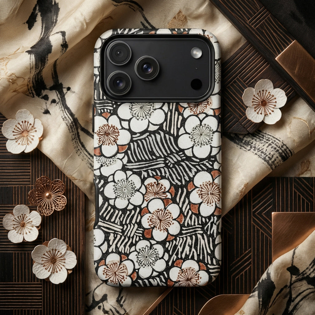 Esto no es un patrón, es memoria lacada en movimiento. Una ensoñación de xilografía botánica, susurrando la filosofía de mono no aware a través de la piel elegante de tu dispositivo. Las flores resonando un mundo antes de la fotografía, cuando la observación significaba reverencia y el adorno era una forma de atención plena.