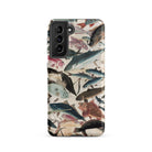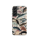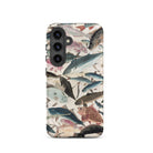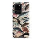 Azules oceánicos, rojos oxidados y aletas negras como la tinta se superponen en un collage viviente, su densidad evoca el bullicio de un concurrido mercado de pescado de Tokio al amanecer. Esta funda de Samsung lleva esa misma abundancia, un acuario de bolsillo lleno de vida y linaje.