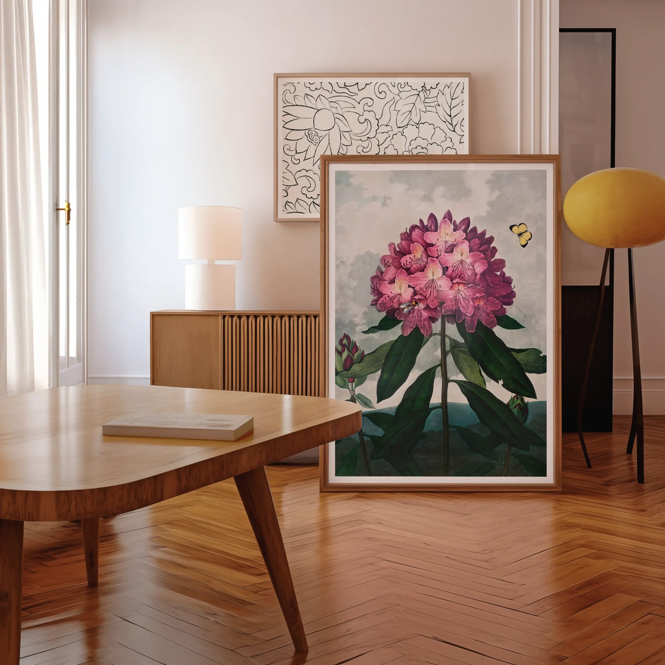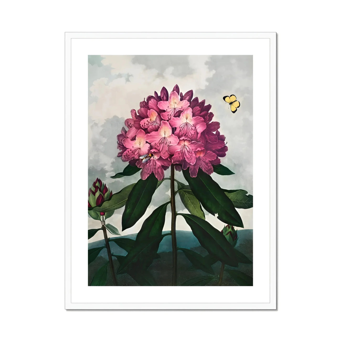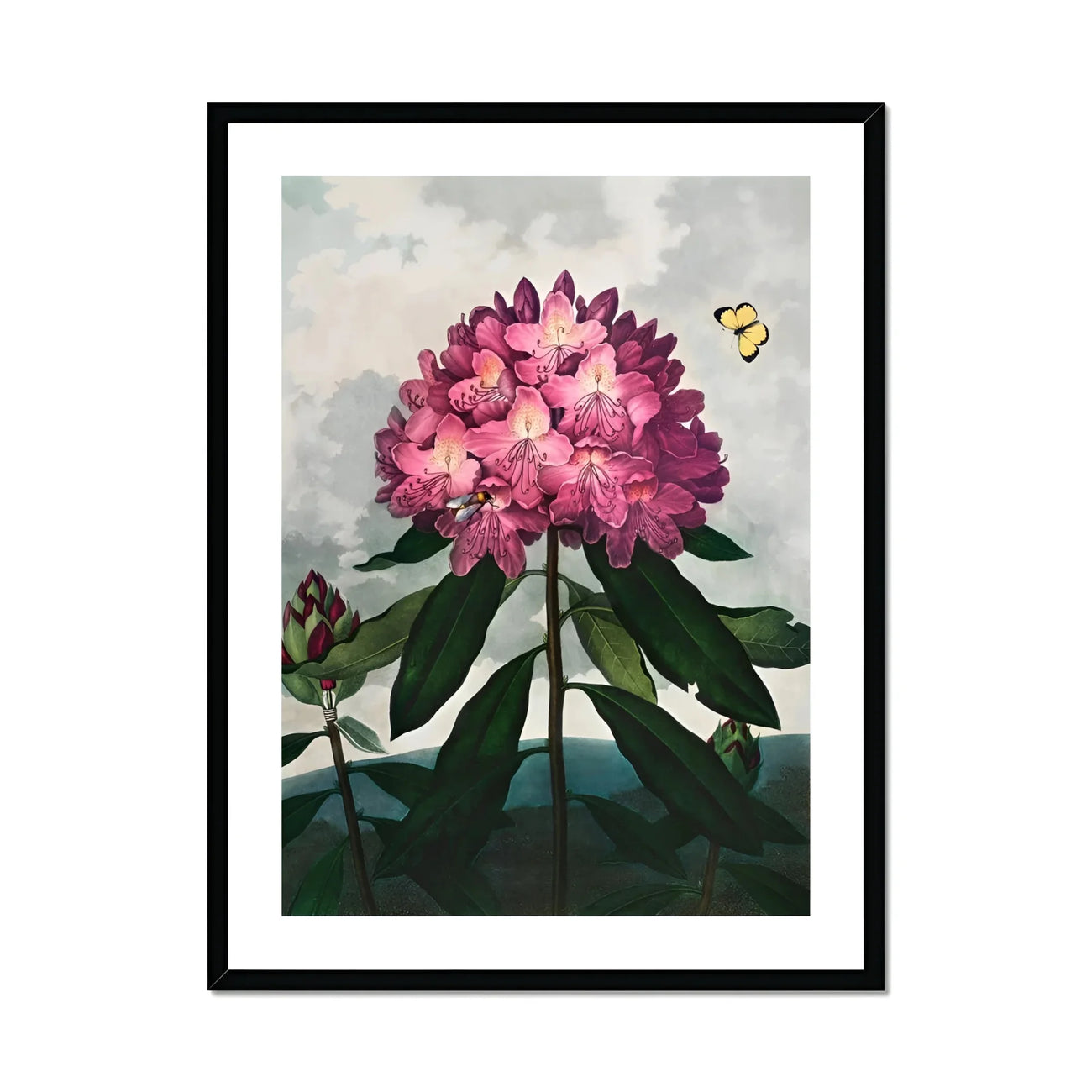 La magia Aquatint de Thornton evoca un rododendro tan realista que jurarás que está perfumando tu habitación. Las flores de fucsia y magenta explotan contra las nubes malhumoradas, mientras que las hojas esmeraldas anclan este fuegos artificiales florales. Una abeja diligente y azufre aleteo mariposa Transforma la escena en un ecosistema en miniatura.