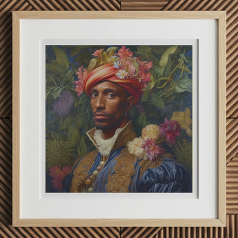 Su turbante, hilado en cornalina y rosa, es una coronación. Un guiño a los sultanes otomanos de la era Tanzimat, la nobleza hausa de Nigeria precolonial, los tocados adornados con seda de los emisarios moros que una vez caminaron por los pasillos de la Alhambra. El brocado de su abrigo está bordado en destellos solares, recordando la iconografía divina de San Mauricio, el caballero negro de la leyenda del Sacro Imperio Romano, sin embargo, su corte no pertenece a la realeza europea sino a la elegancia indomable de los dandis del Renacimiento de Harlem. Es un hijo de los reyes Vodun de Ouidah, del exceso de la corte francesa, de cada artista que alguna vez pintó la belleza en existencia y se negó a disculparse por ello. Y esas flores, enredadas en su cuello y tejidas a través de los pliegues de su turbante—¿son un tributo a la decadencia de naturalezas muertas de Jean-Baptiste-Siméon Chardin, o un sutil guiño a los ramos dejados a los pies de las drag queens que hacían voguing en clubes parisinos subterráneos? Quizás ambos.