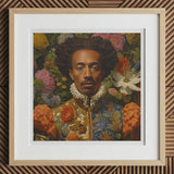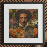 Las flores no lo enmarcan; florecen de él—su derecho de nacimiento se manifiesta en el mismo simbolismo hortícola que codificó queer el romance victoriano, donde las violetas significaban devoción y los crisantemos susurraban sobre vidas no vividas. Un tapiz de rebelión y reverencia, esta fina estampa de arte de opulencia afro-queer es una coronación, una resurrección, una carta de amor a cada príncipe negro que la historia intentó olvidar.