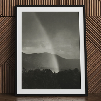 Sumérgete en la belleza etérea de "Rainbow" (1920) de Alfred Stieglitz, un fascinante fotográfico en blanco y negro estampado de arte Eso captura la magia fugaz de la naturaleza en monocromo. Transportándote a una escena de malhumorado junto al lago donde un luminoso arco iris atraviesa nubes de tormenta siniestras, creando una dramática interacción de luz y sombra.