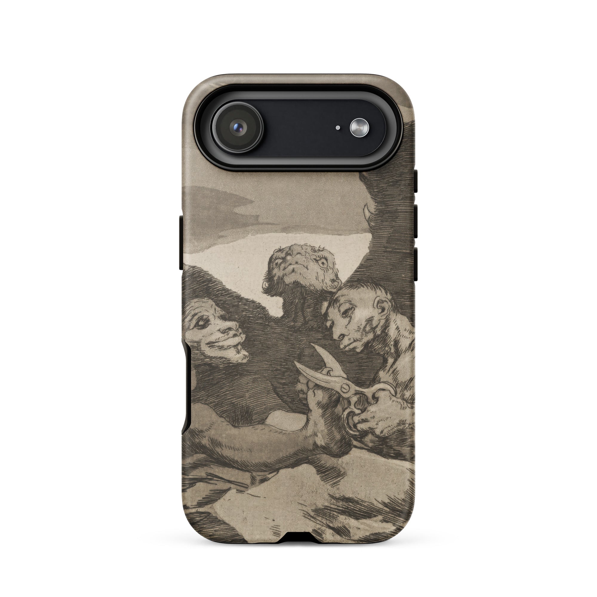 El cuadro "Ellos se acicalan" de Goya escenifica un salón macabro en esta funda de iPhone. Figuras grotescas se agrupan de cerca, sus rostros retorcidos flotando sobre una mano que sostiene tijeras, lista para recortar extremidades con garras.