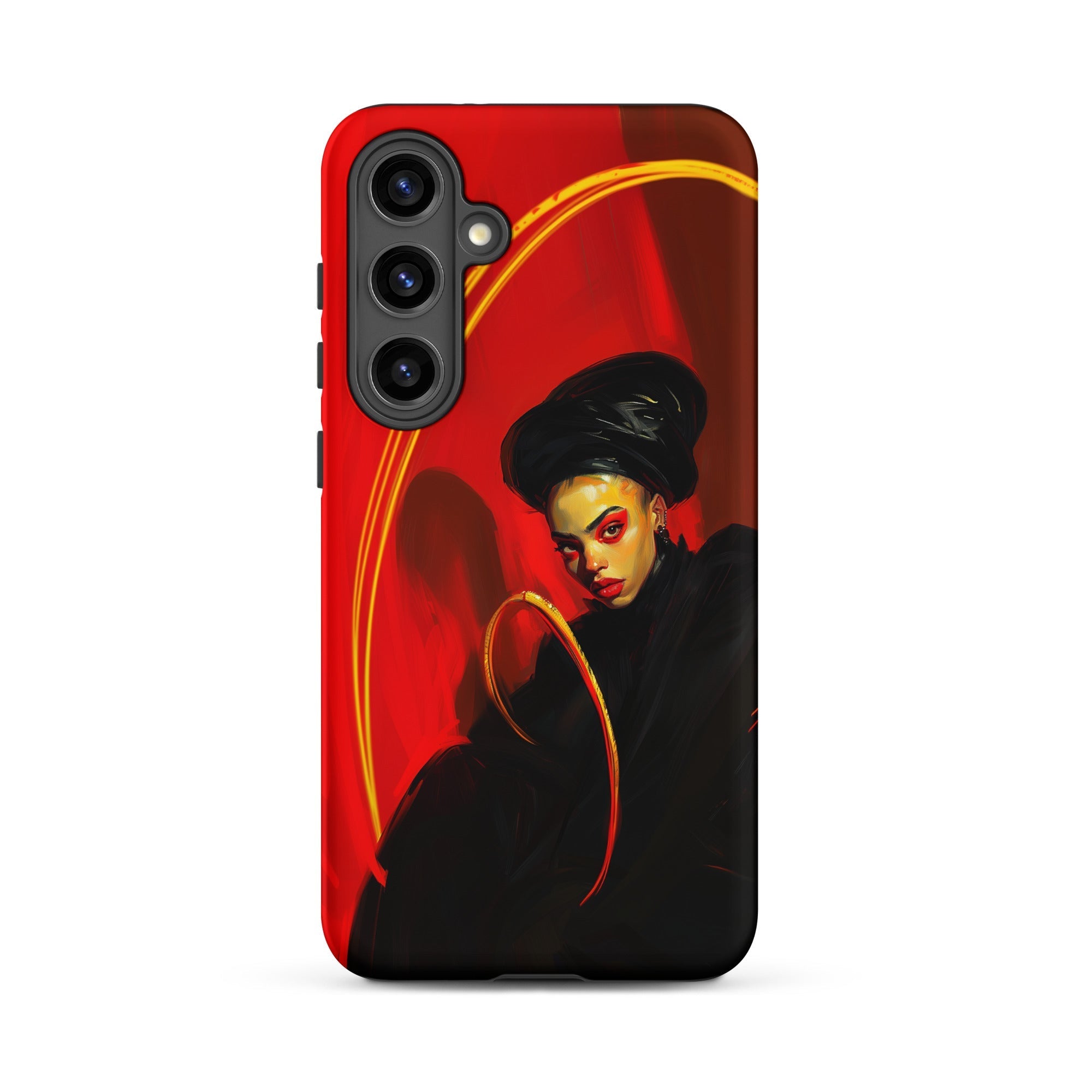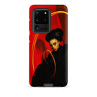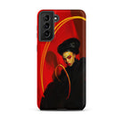 Su corona turbante se eleva como una llama negra, capturando cada destello del resplandor infernal detrás de ella. Su mirada—directa, deliberada—te atrae hacia el centro de su gravedad. Ojos afilados en ocre y ámbar se fijan en los tuyos, prometiendo hechizos tejidos en seda y acero. El fondo rojo vibra con calor, presionando su silueta en la retina, negándose a liberar.