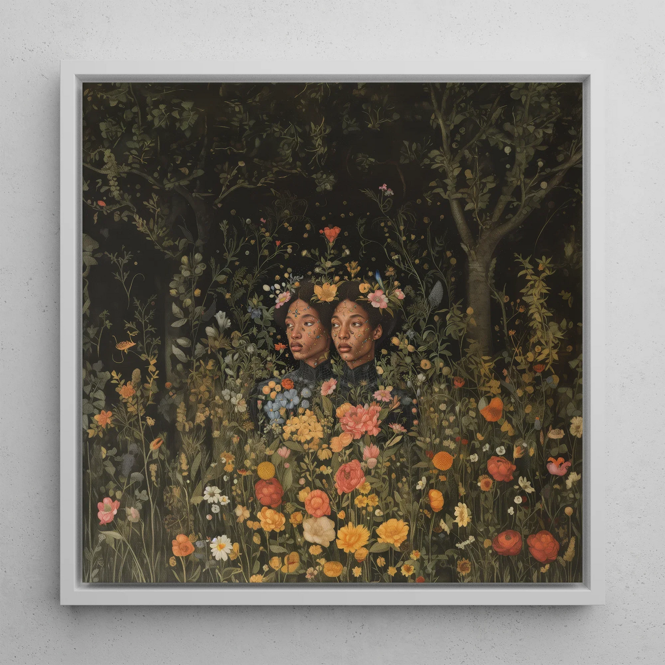 Dos almas espejadas se elevan desde un jardín de fuego tranquilo—Negras, transgénero, luminosas. Sus rostros, tejidos con delicadas flores, se disuelven en el abrazo de la naturaleza, como si el mismo tiempo las susurrara a la existencia. Sombras de medianoche acunan sus formas, mientras pétalos dorados ascienden como constelaciones a través de su piel, trazando un linaje sagrado de resiliencia y renacimiento.