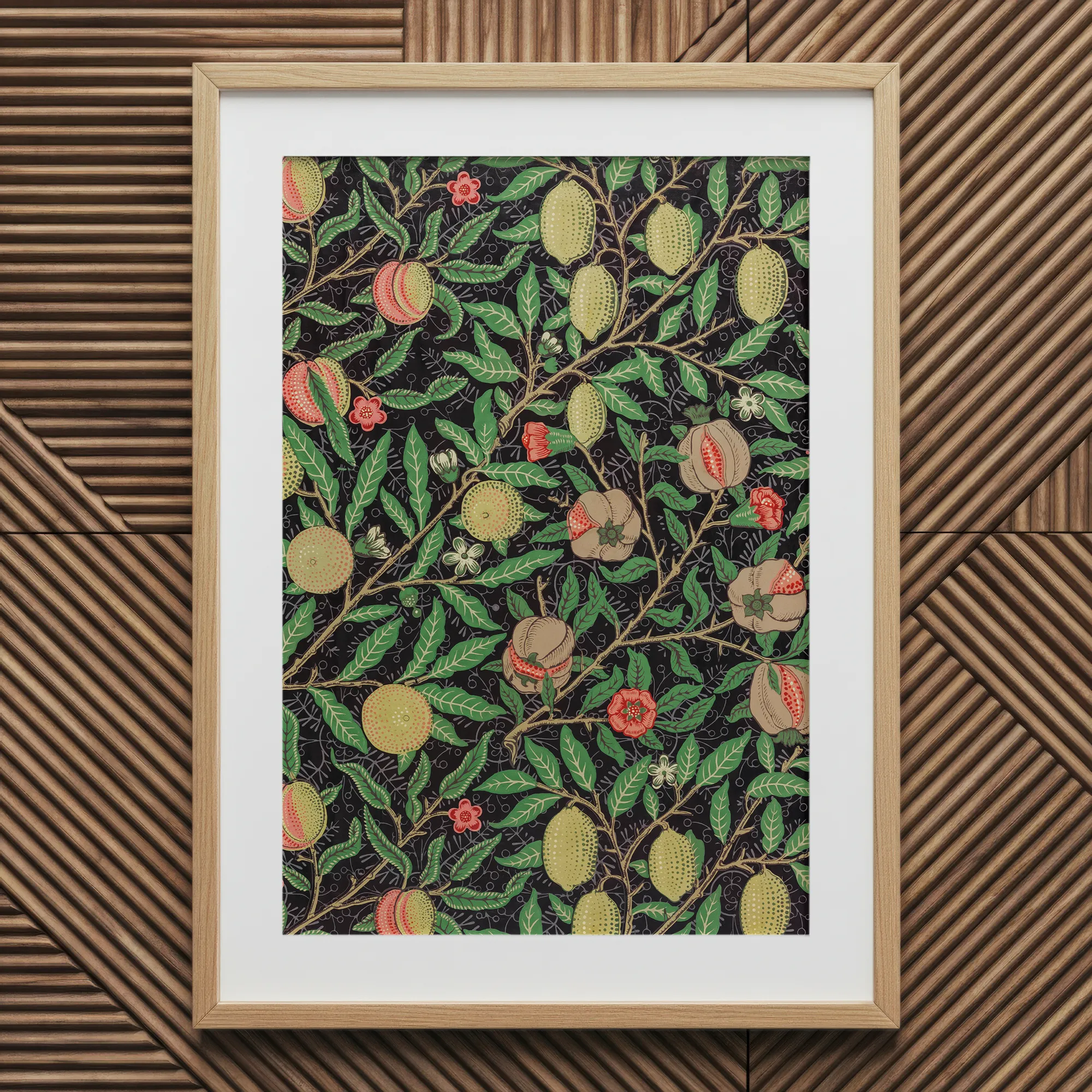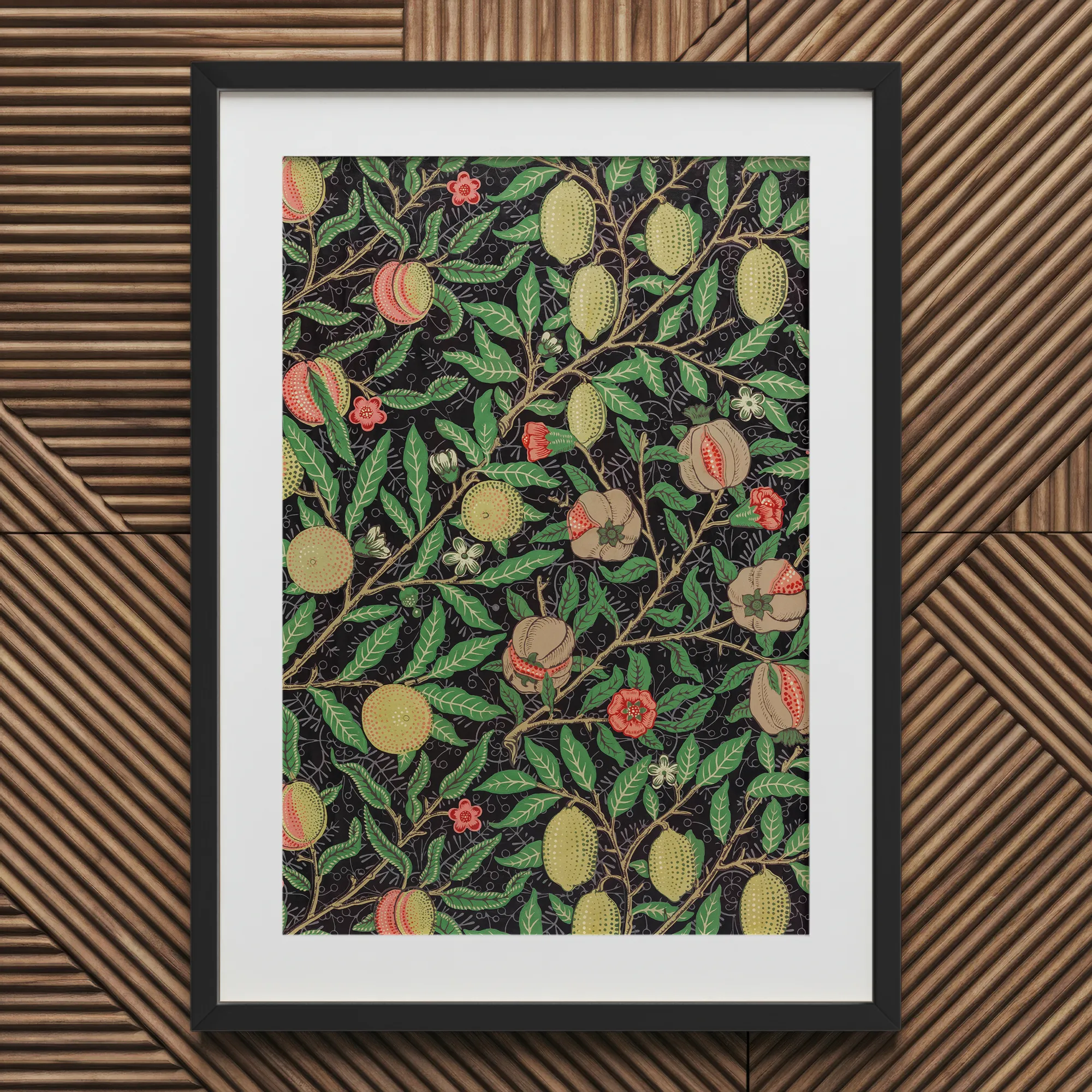 Contempla la "Cuatro Frutas" de William Morris impresión artística, una sinfonía botánica contra un fondo oscuro. Esta cornucopia victoriana muestra el revolucionario ethos de Artes y Oficios de Morris, entrelazando limones maduros al sol, granadas sonrojadas y delicadas flores en una danza hipnotizante de forma y color. La piel punteada de cada fruta y el intrincado veteado del follaje ejemplifican la dedicación de Morris a la artesanía y la perfección de la naturaleza.