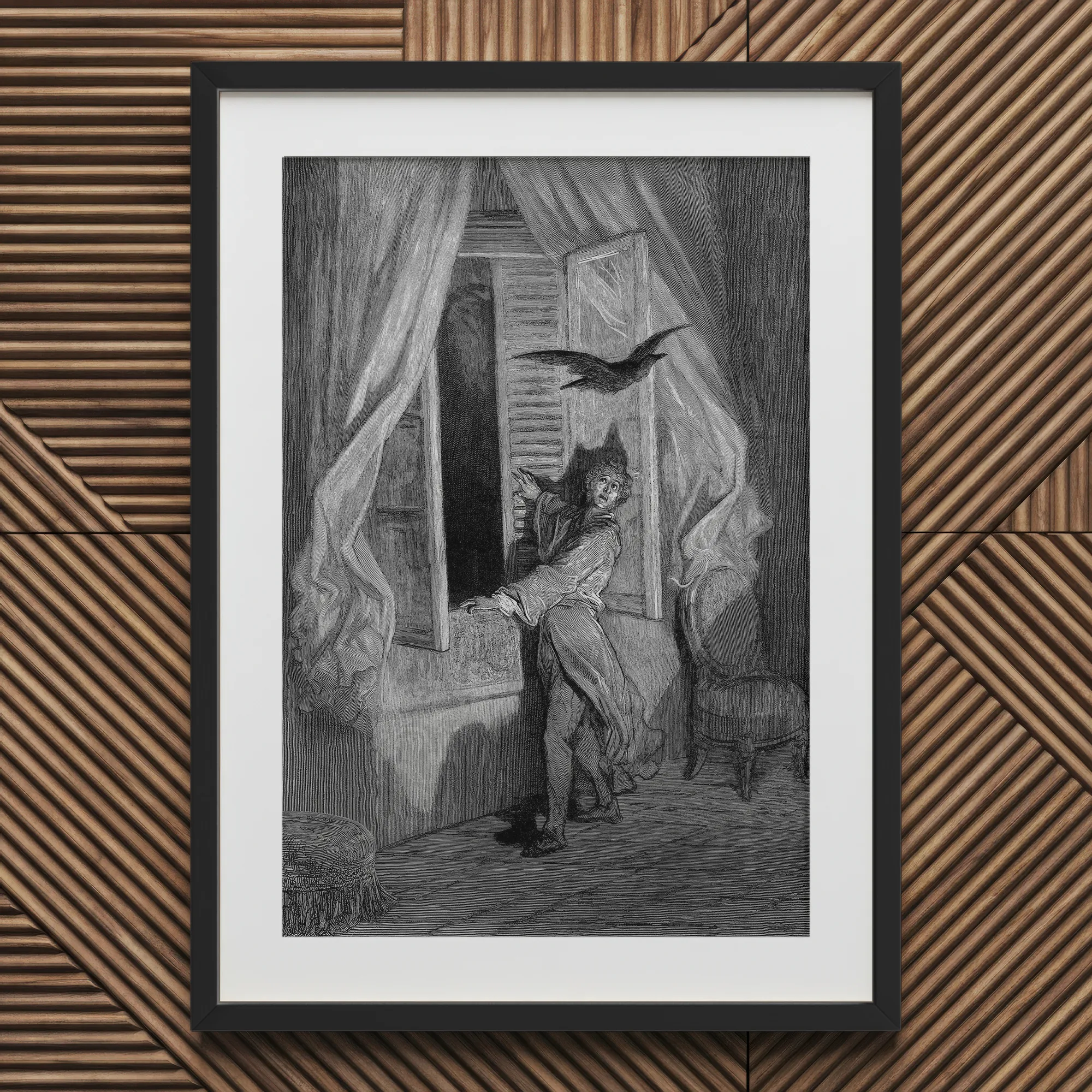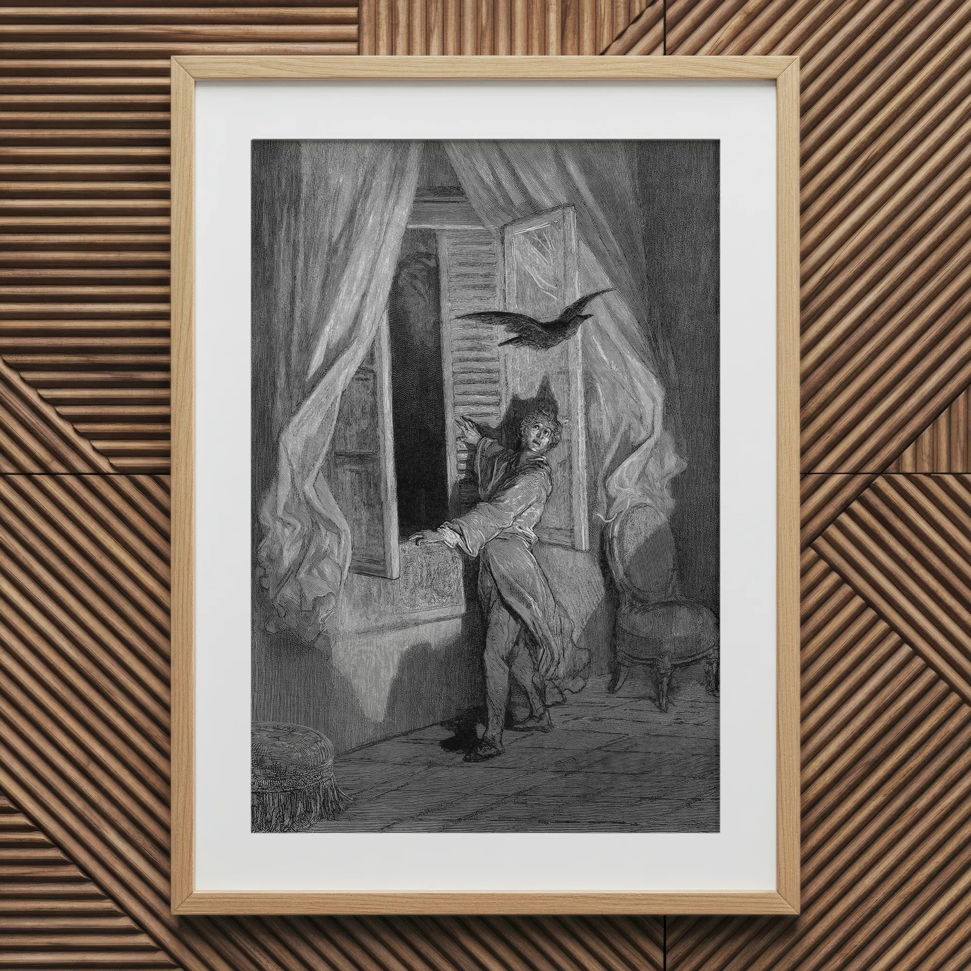 Within Doré’s engraving, night behaves like thought: recursive, relentless, alive. The scholar leans forward, face carved from exhaustion, eyes fixed on that imperial bird frozen atop the bust. Around them, curtains swell as if the walls breathe sorrow.