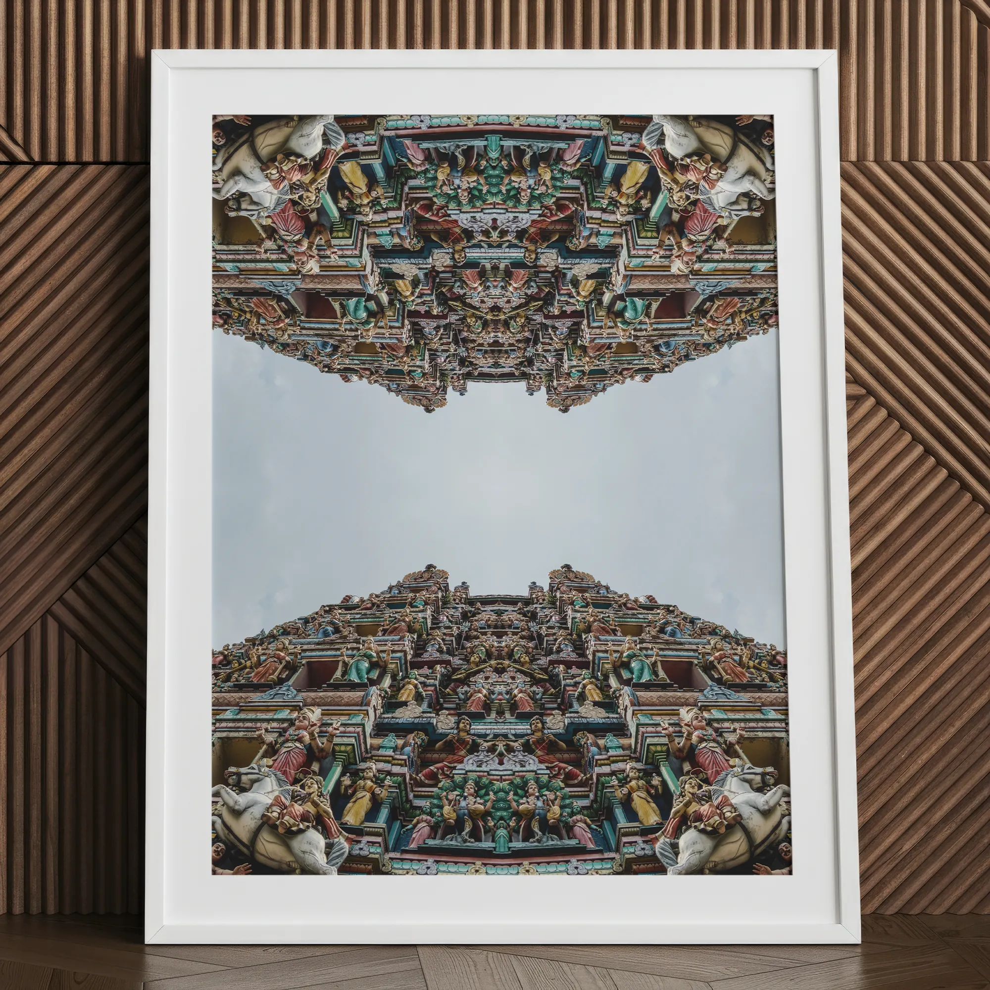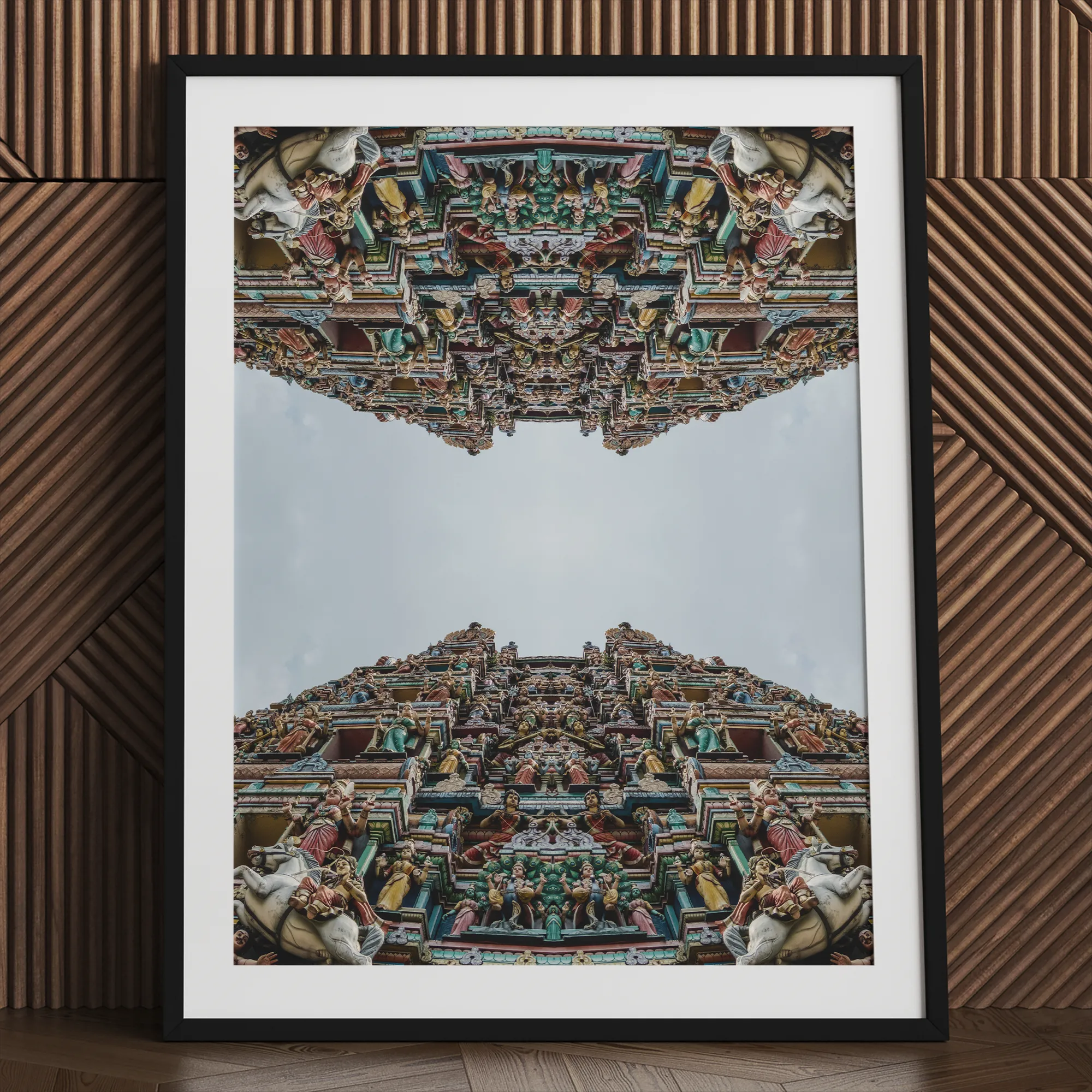 La simetría hipnótica de la impresión, creada al reflejar las intrincadas tallas de Gopuram, evoca el concepto de darshan, viendo y siendo visto por lo divino. Tus ojos atravesarán niveles de deidades, cada una figura esculpida como un portal al antiguo mitos y verdades cósmicas.