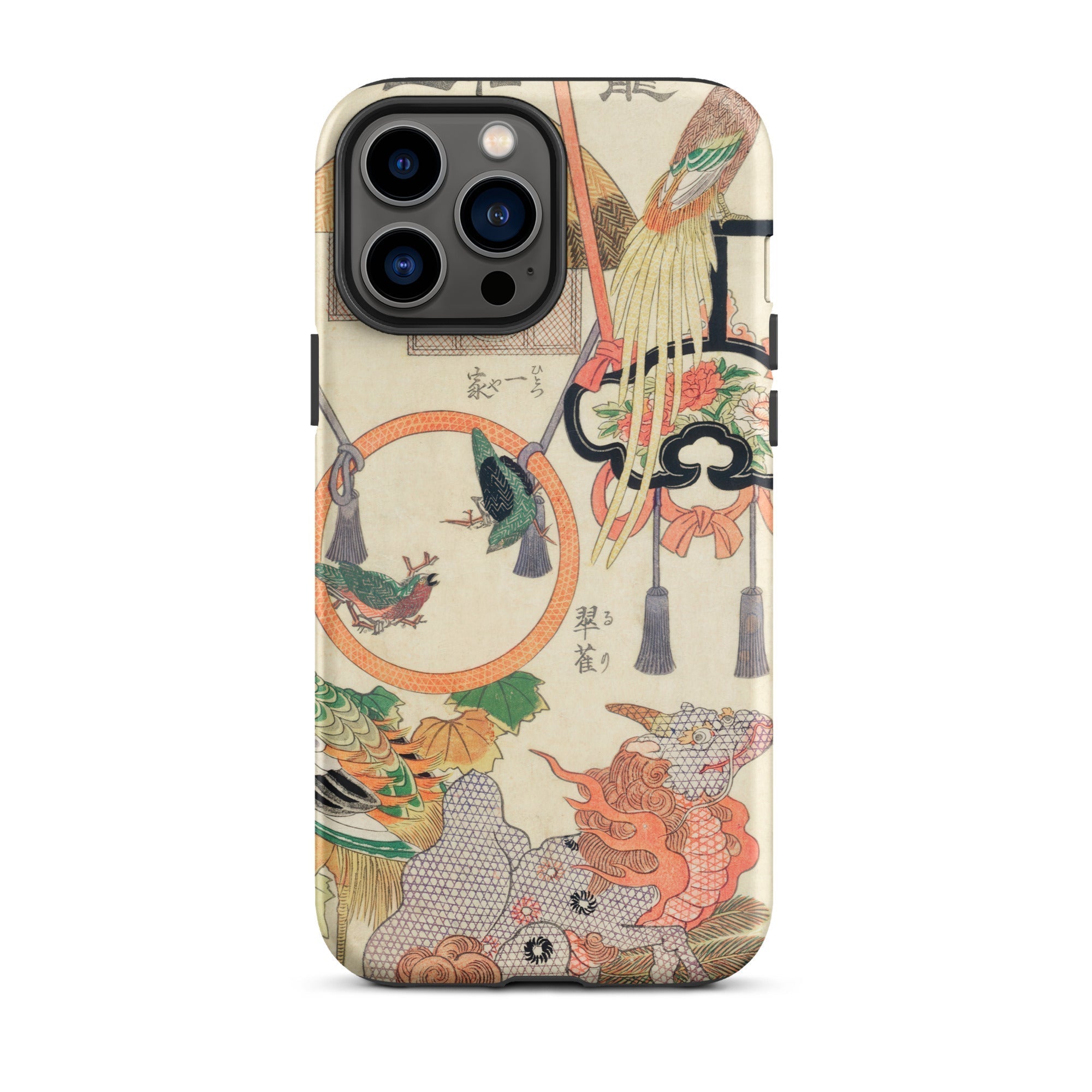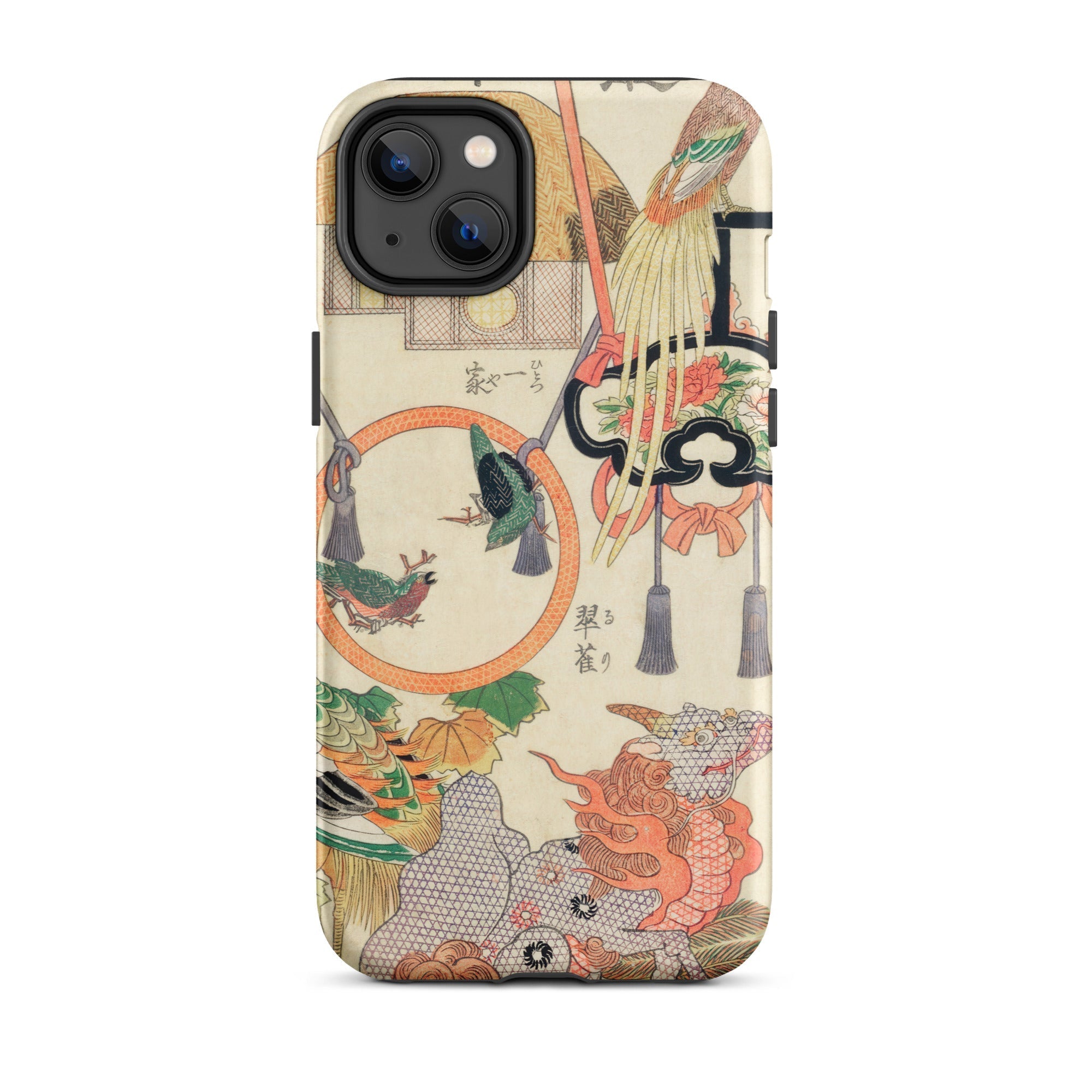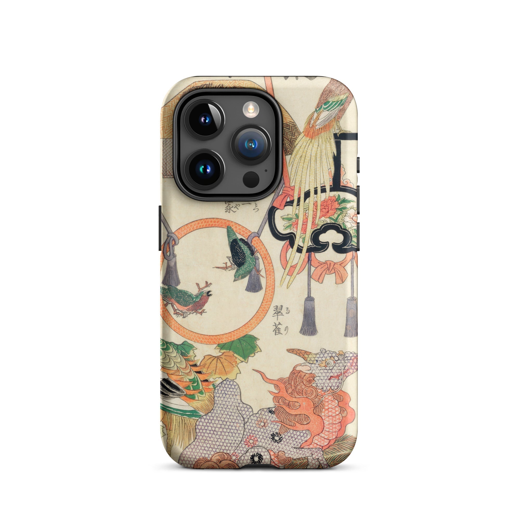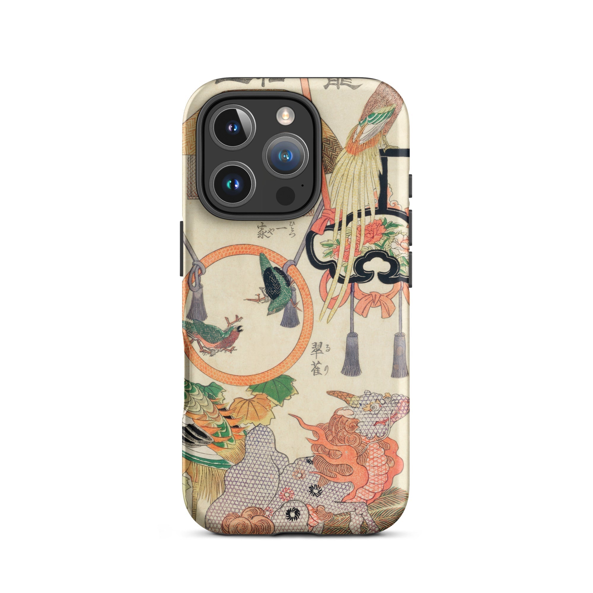 Esta funda para iPhone de grabado en madera japonés refracta el kazarimono a través de una lente del siglo XXI. Y estarás sosteniendo un ensamblaje de iconografía Heian, folklore shishimai, auspiciosidad shōchikubai y simbolismo textil del periodo Edo recontextualizado como arte móvil. Un estuche no solo para protección, sino para comunión. Entre tinta e interfaz, ritual y recursión, antigua artesanía y tus aventuras diarias a través de internet.