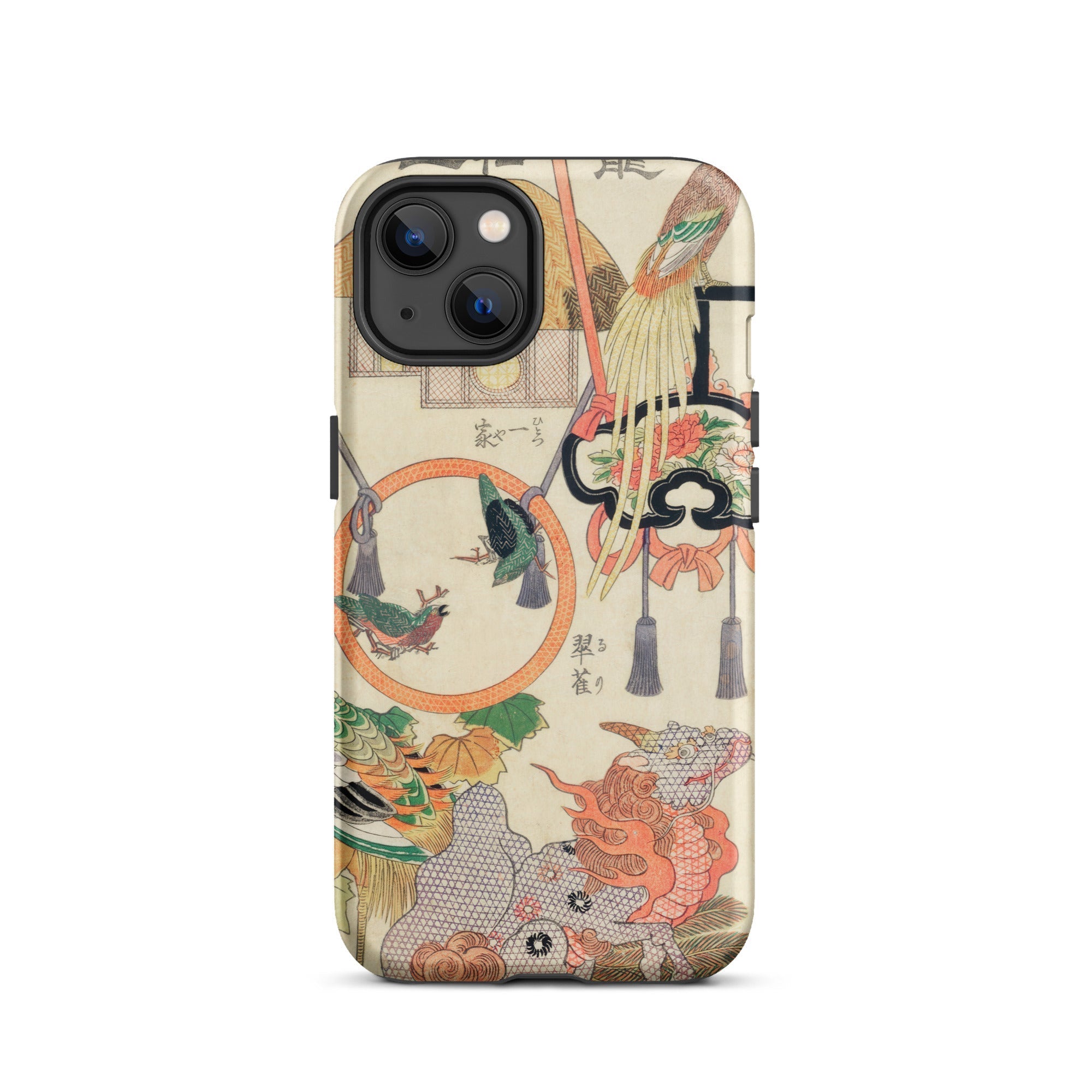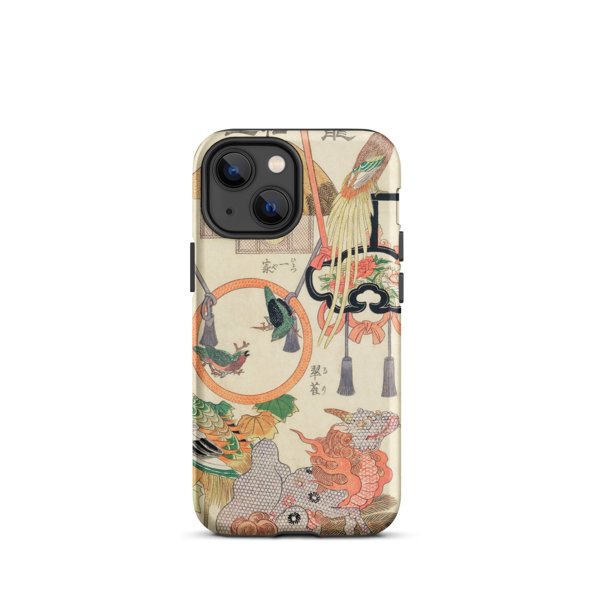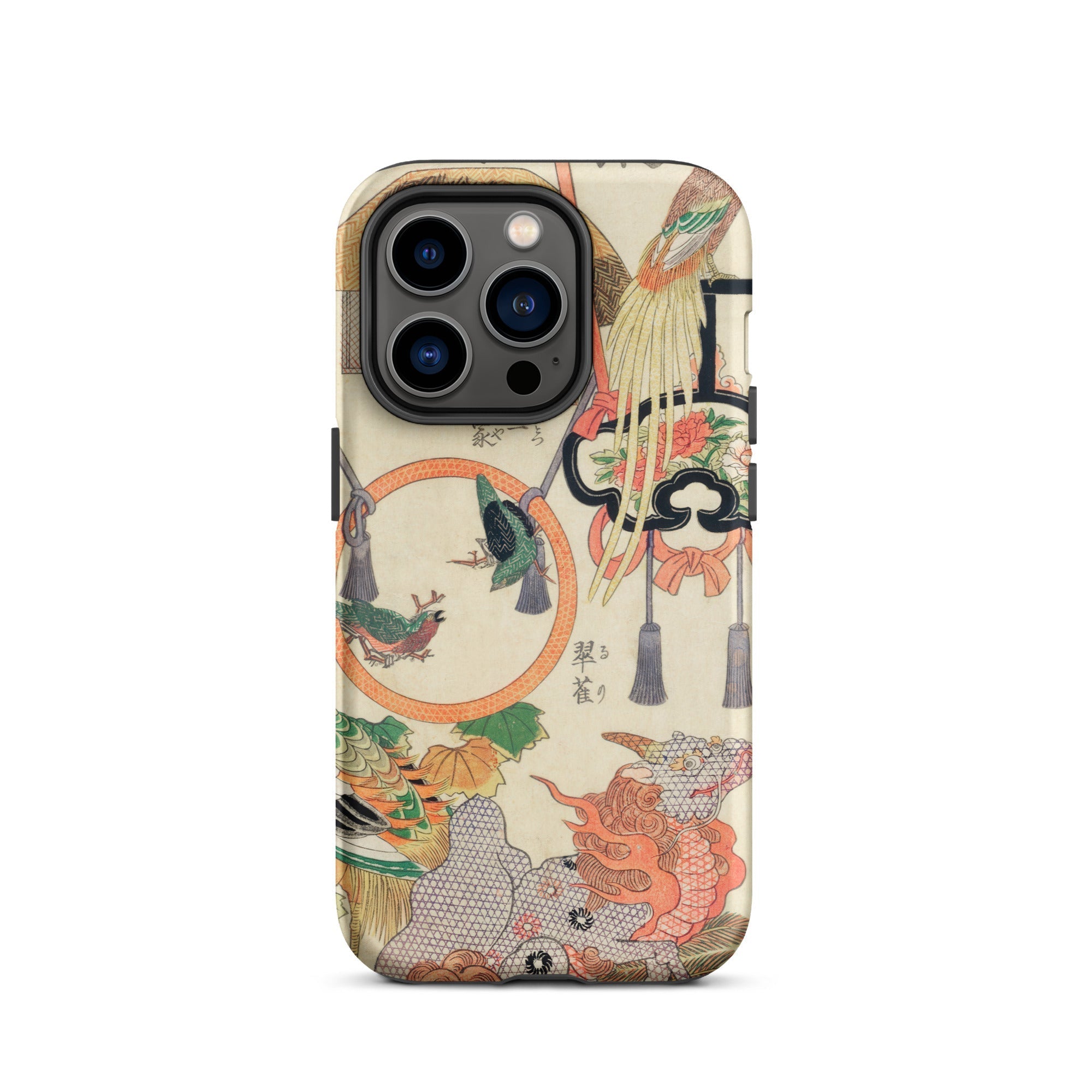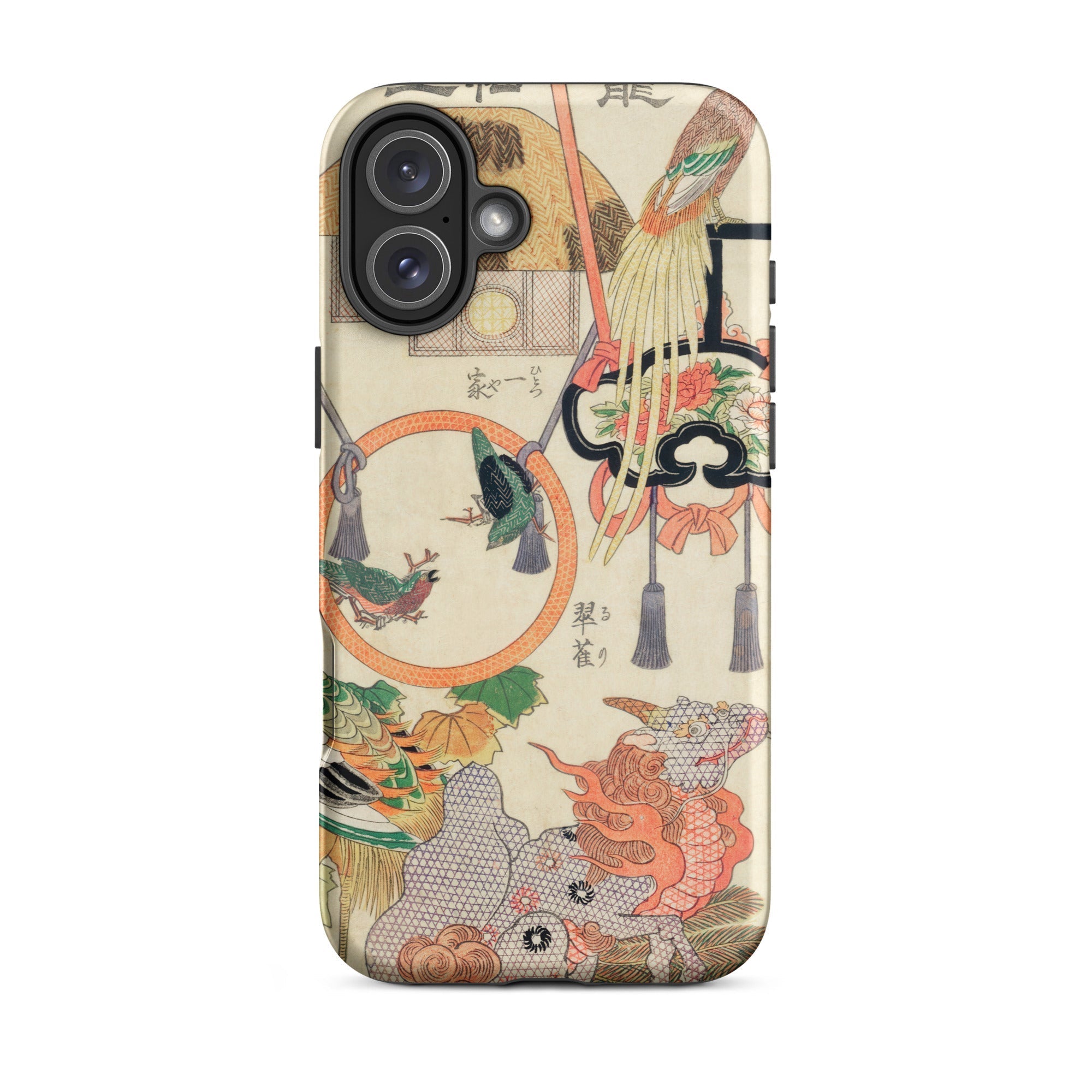 Esta funda para iPhone de grabado en madera japonés refracta el kazarimono a través de una lente del siglo XXI. Y estarás sosteniendo un ensamblaje de iconografía Heian, folklore shishimai, auspiciosidad shōchikubai y simbolismo textil del periodo Edo recontextualizado como arte móvil. Un estuche no solo para protección, sino para comunión. Entre tinta e interfaz, ritual y recursión, antigua artesanía y tus aventuras diarias a través de internet.