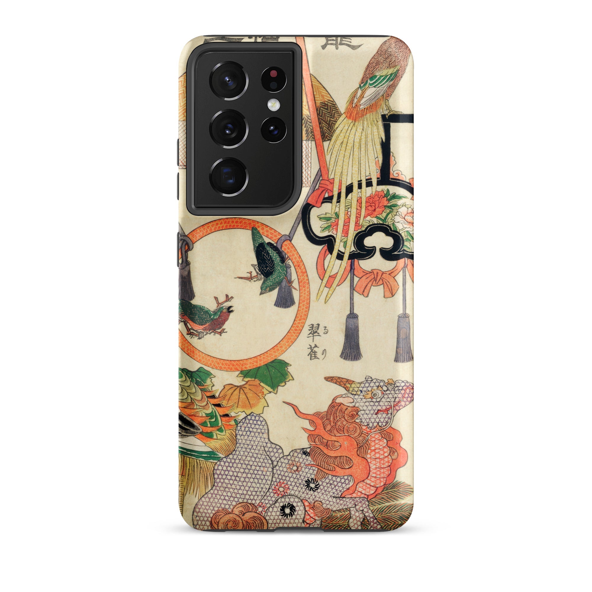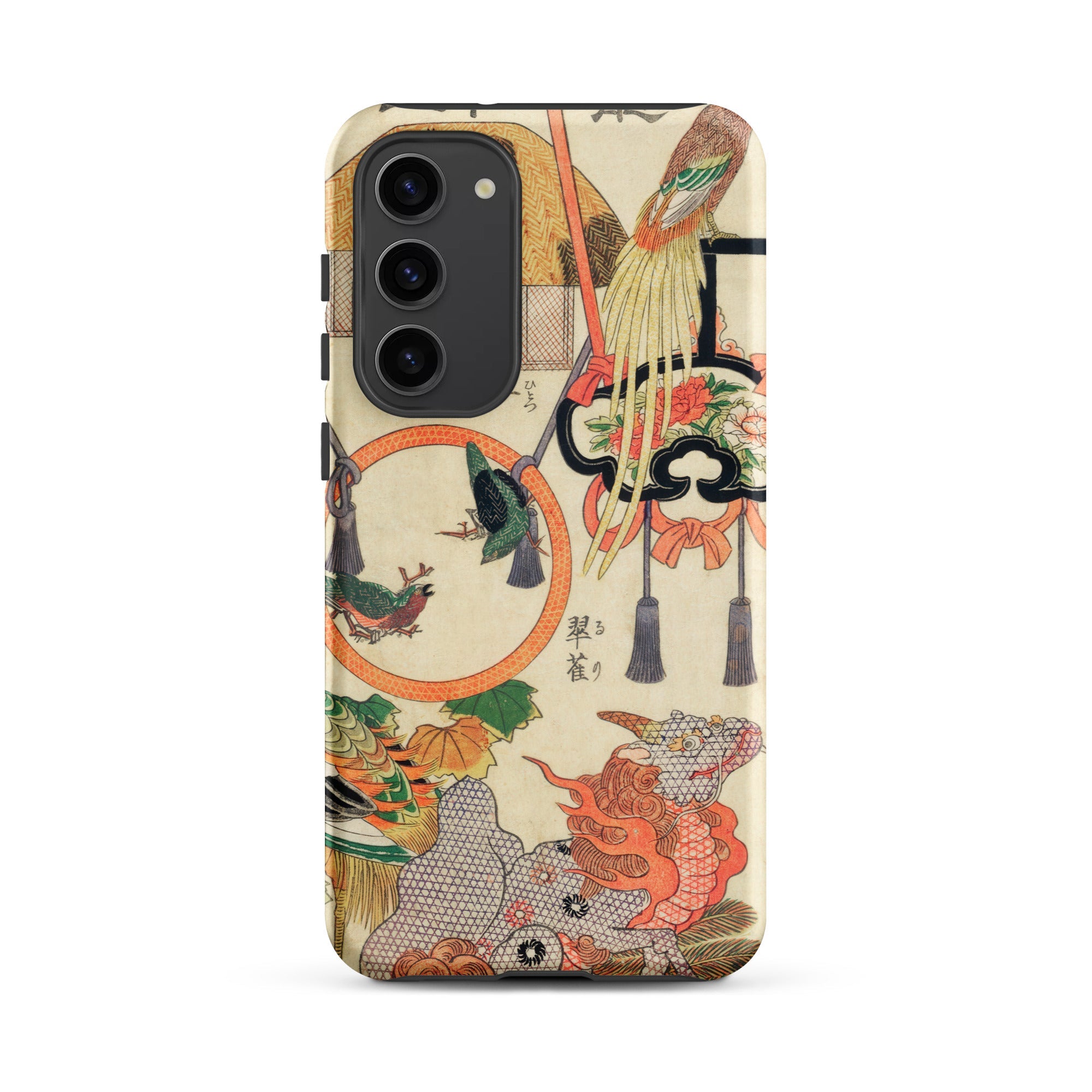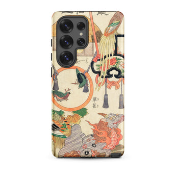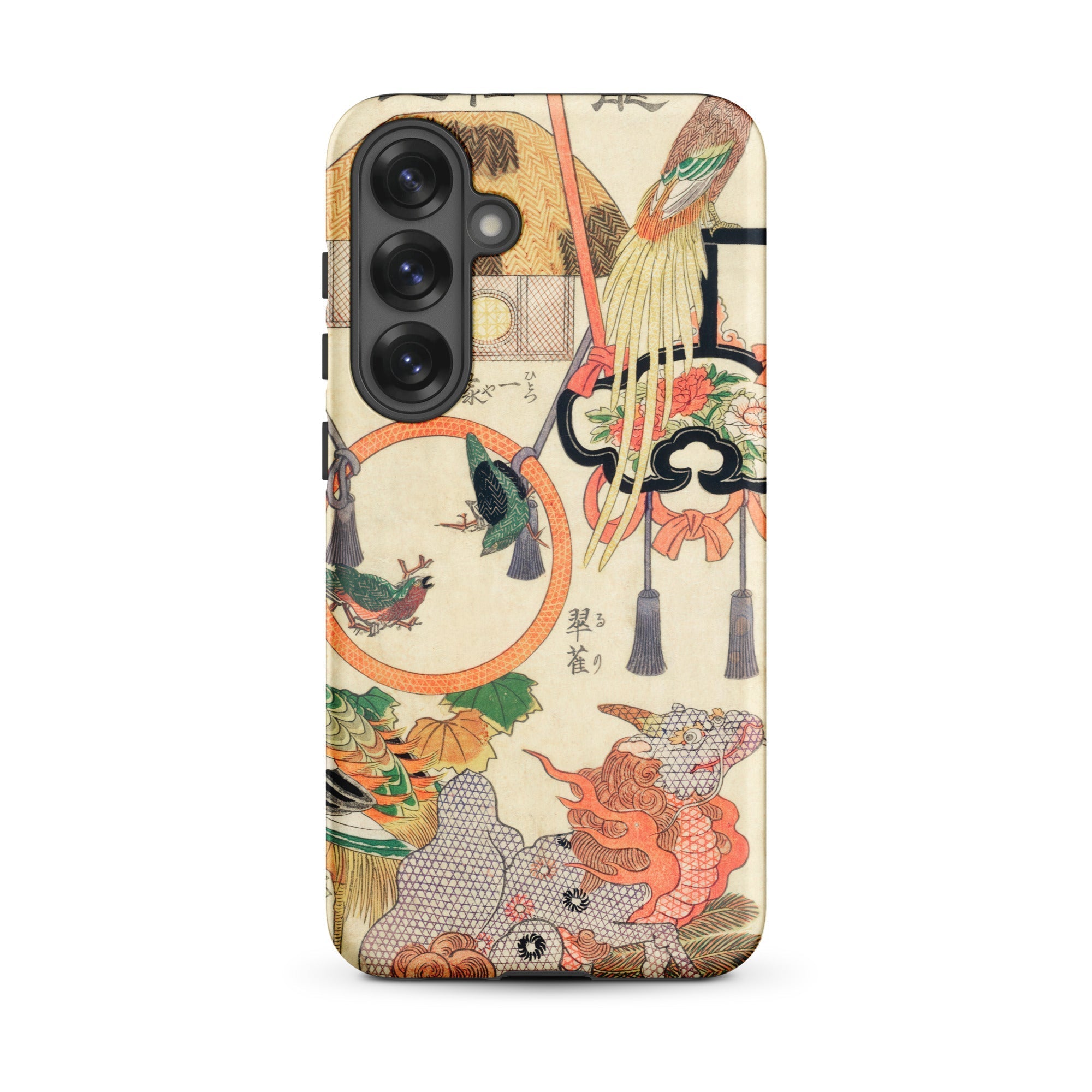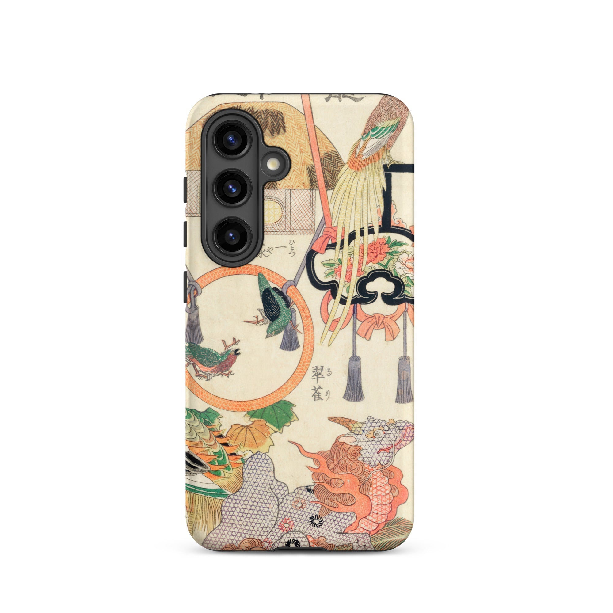 En este estuche de Samsung, la ilustración de cestería de Ichida Shoshichiro de Naniwa brilla con la elegancia del período Edo. Intricados patrones de tejido se despliegan a través de plumas de fénix, adornos de anillos, borlas y follaje, donde criaturas míticas colisionan con formas decorativas.
