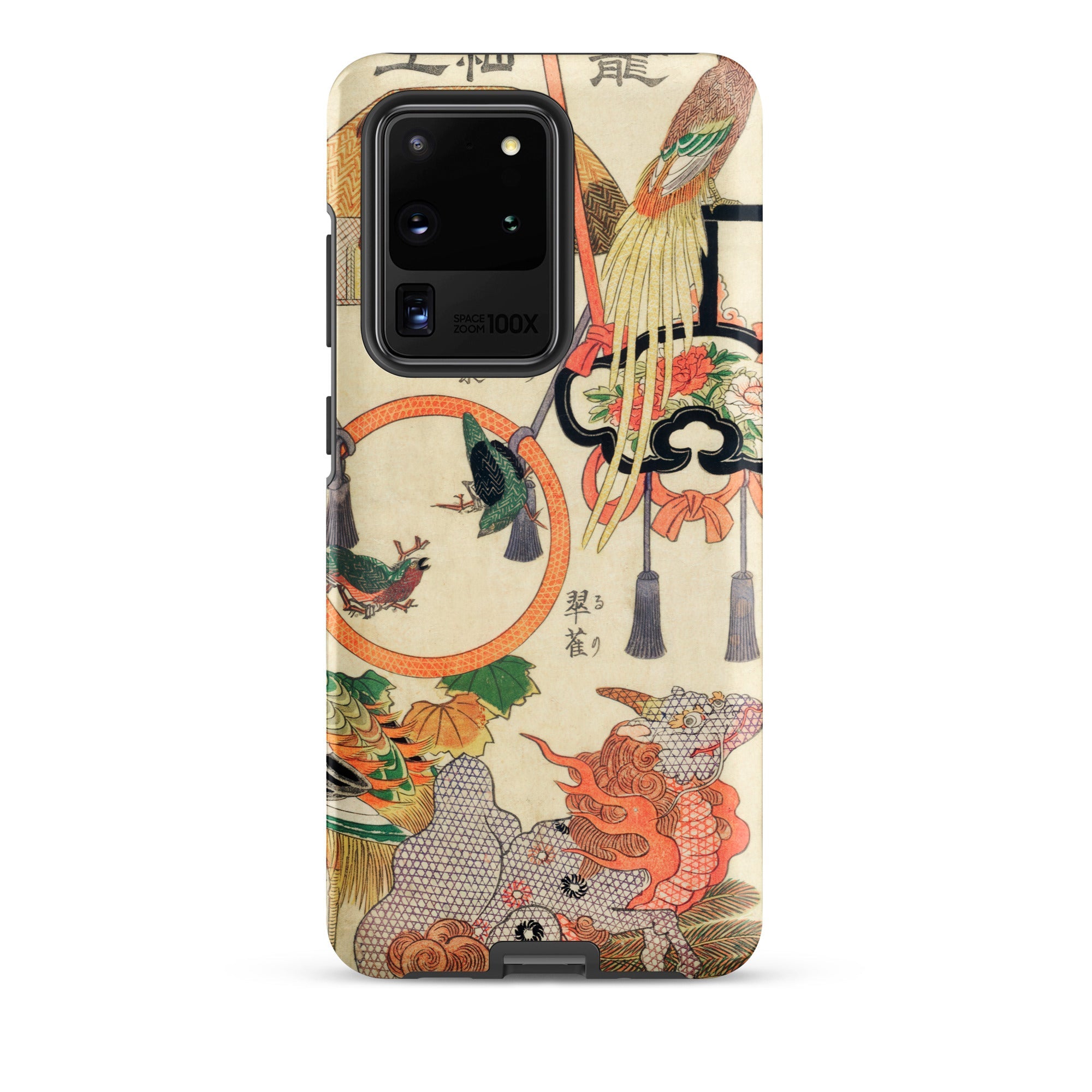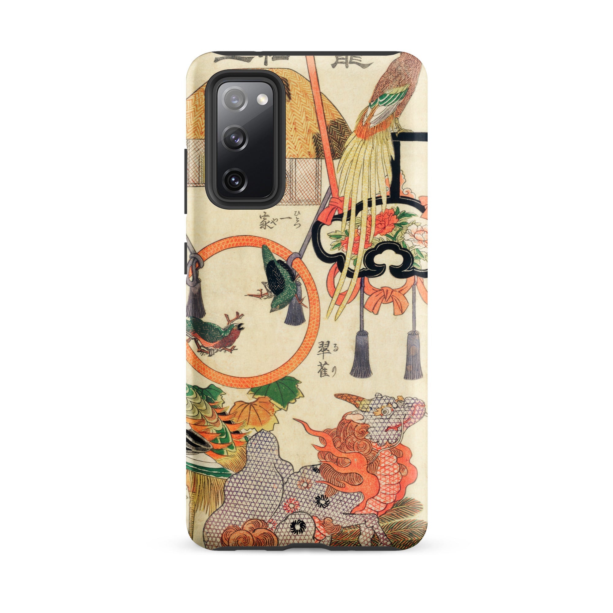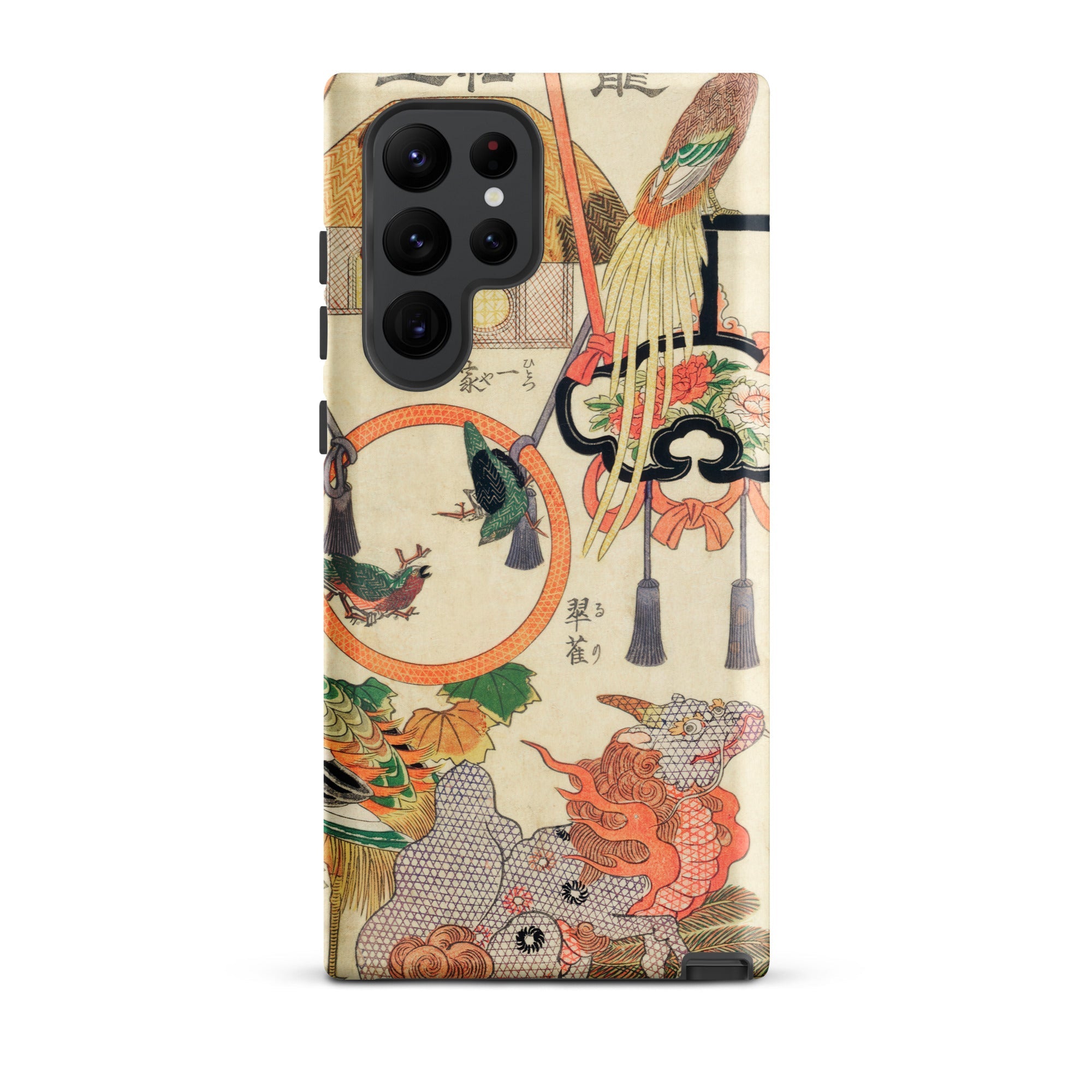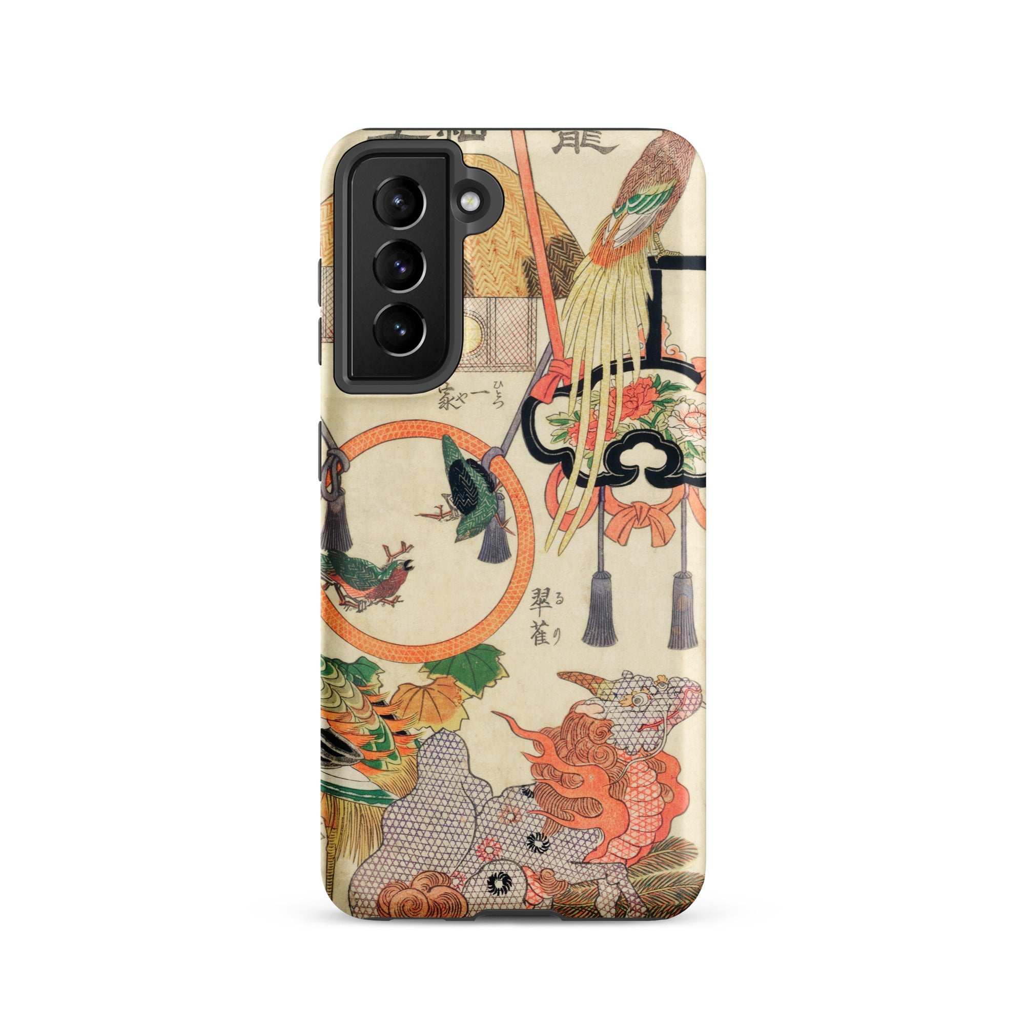 En este estuche de Samsung, la ilustración de cestería de Ichida Shoshichiro de Naniwa brilla con la elegancia del período Edo. Intricados patrones de tejido se despliegan a través de plumas de fénix, adornos de anillos, borlas y follaje, donde criaturas míticas colisionan con formas decorativas.