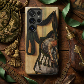 Este estuche de Samsung se convierte en armadura y espectáculo, recordando la pompa barroca, los rituales de caza, el deporte aristocrático y la astucia silenciosa de las aves de presa. Una funda protectora que escenifica teatro sobre vetas de madera, donde cada lazo de cuerda y cada destello de adorno dorado realiza un espectáculo.
