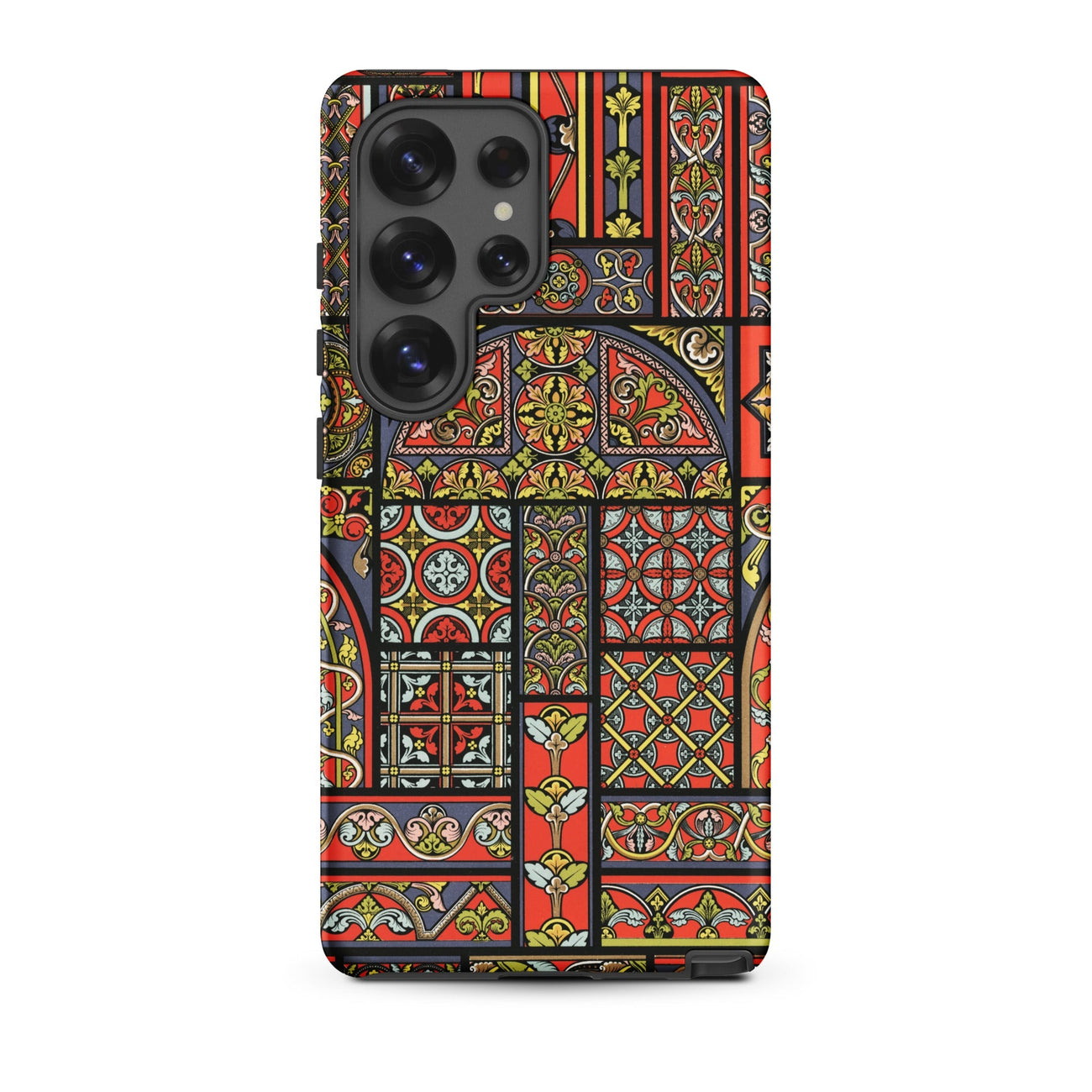Los paneles escarlata brillan entre las celosías de negro. Sus arcos con celosías engalanados con cuatrifolios, trifolios y flores de acanto doradas. La meticulosa placa medieval de Auguste Racinet se convierte en una fachada de catedral portátil, resplandeciente con patrones que alguna vez se vertieron en arena fundida, enfriados en rubí y zafiro.