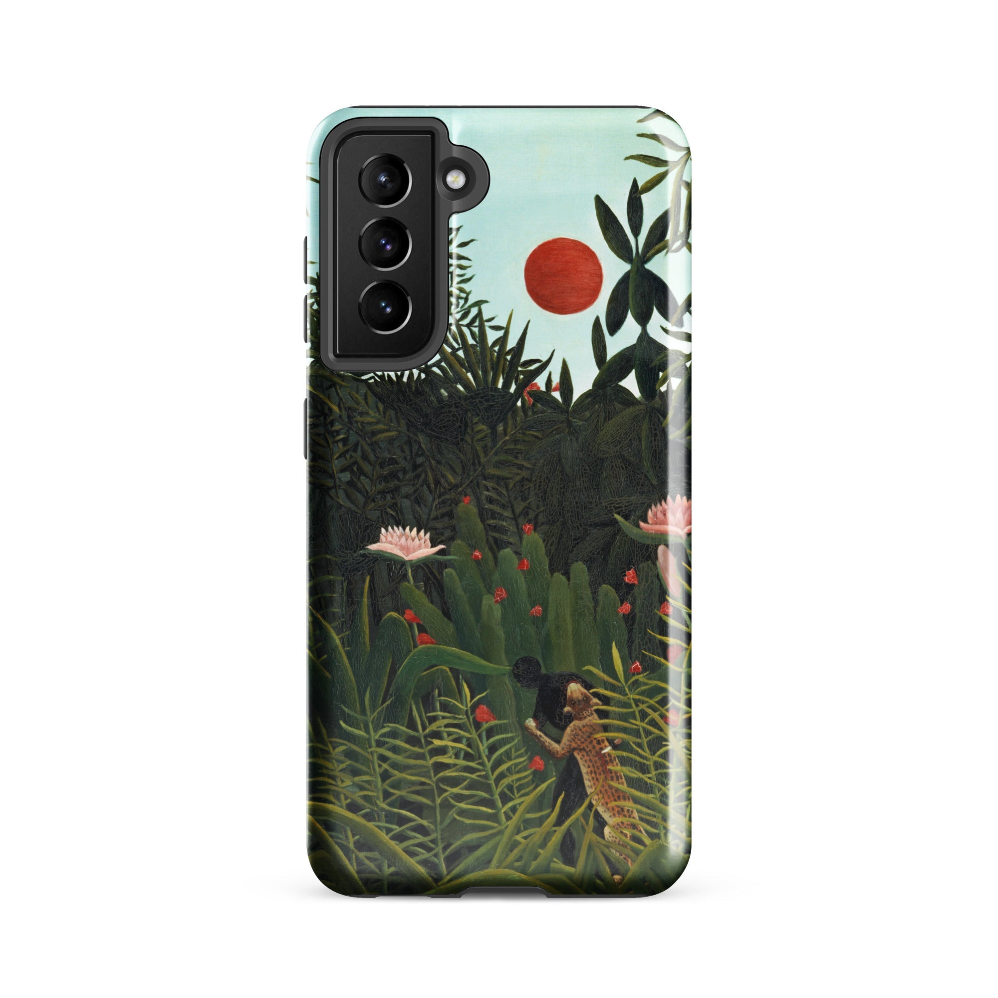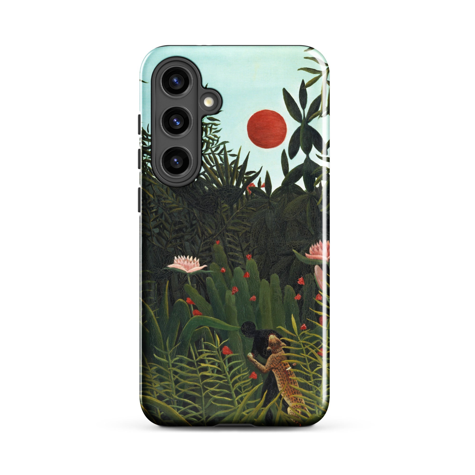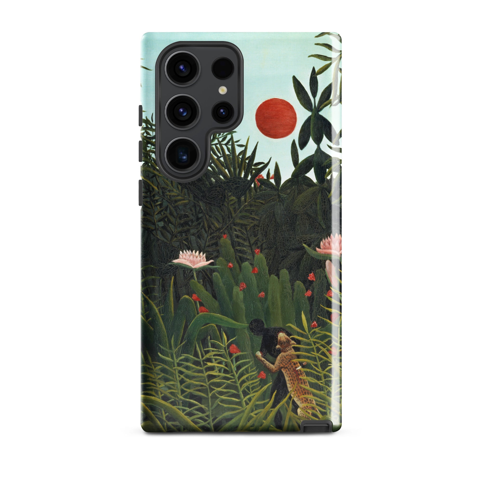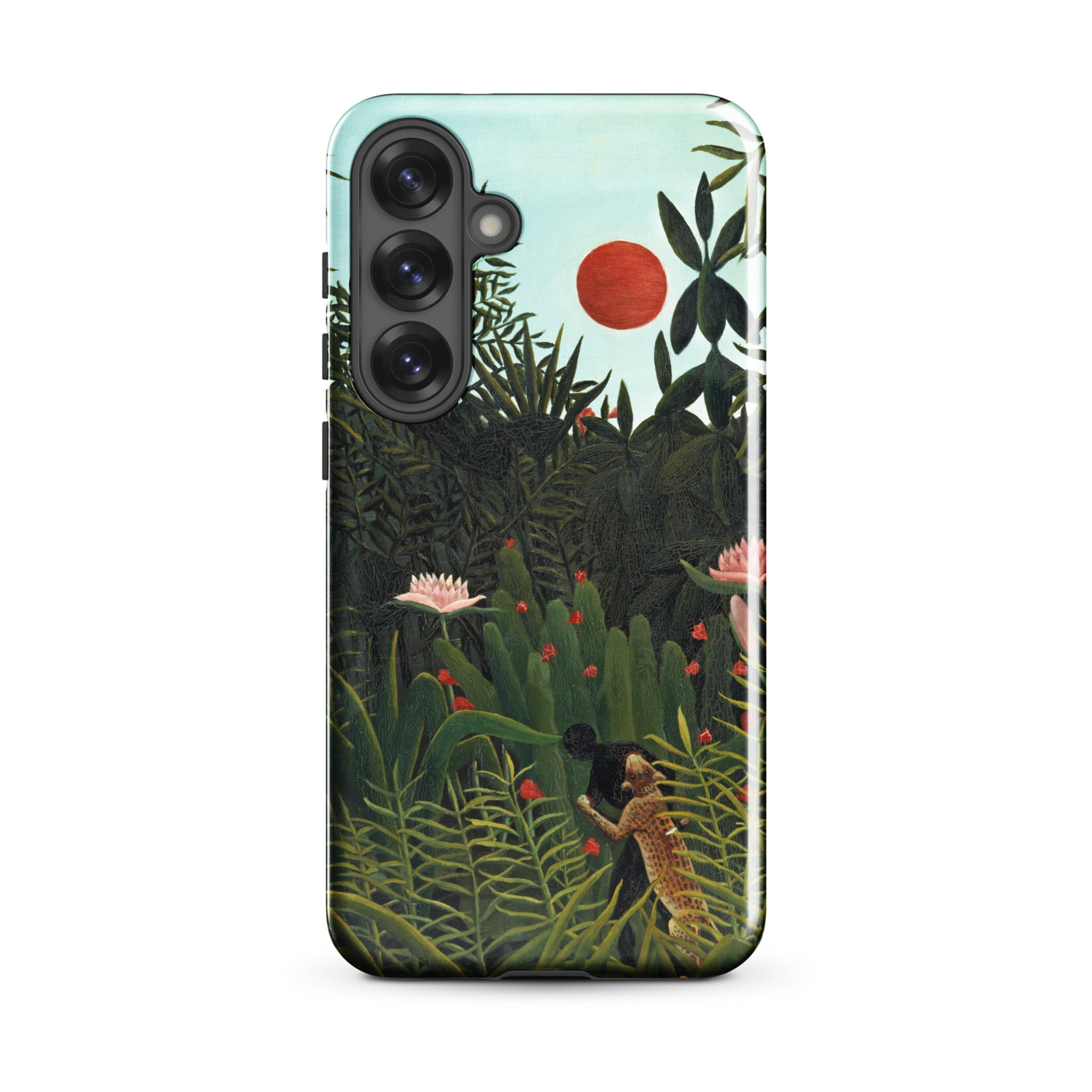 Henri Rousseau’s Virgin Forest unfurls a dreamlike thicket where scale dissolves into rhythmic greenery. Deep emerald fronds overlap with precise, hard-edged clarity, mimicking the humid air of the Jardin des Plantes.