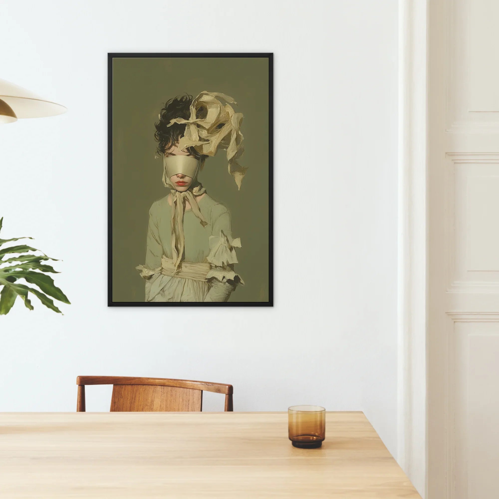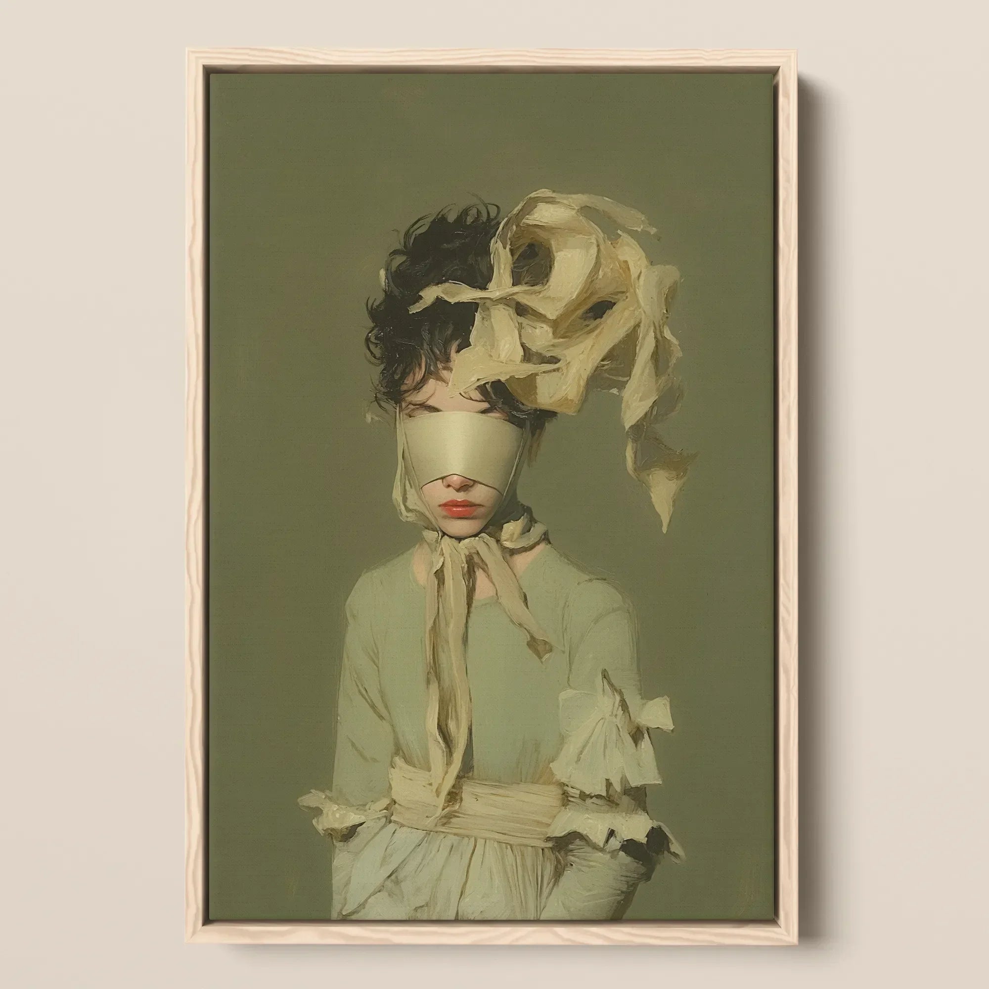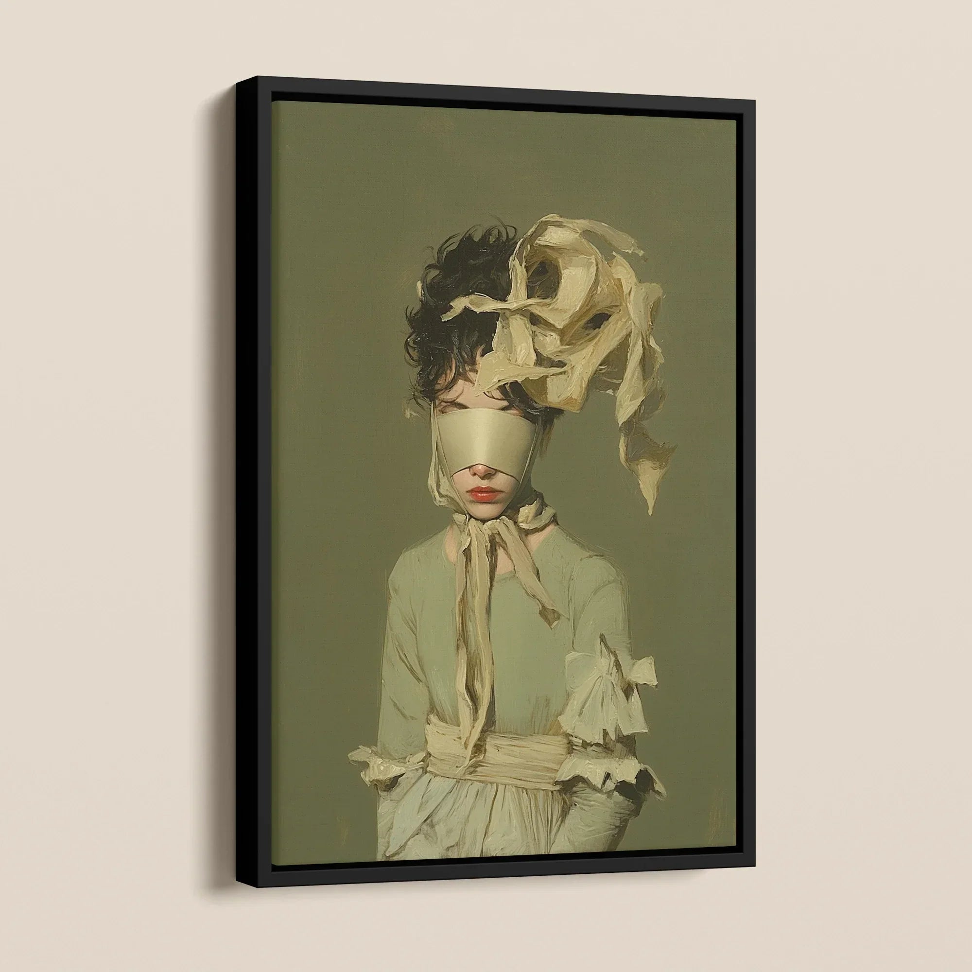 Suspenso entre el pasado y el presente, esta impresión en lienzo enmarcado respira con los fantasmas de la restricción victoriana y la reinvención moderna. Una figura, esculpida de sombra y seda, se alza atada en el dialecto estético de la moda victoriana moderna: elegancia cosida con tensión, belleza entrelazada con silenciosa rebelión. Su visión es robada por una venda pálida, estirada como el silencio antes de una tormenta. Y sin embargo, sus labios arden a través del silencio, desafiando el borrado: rojos como secretos susurrados...