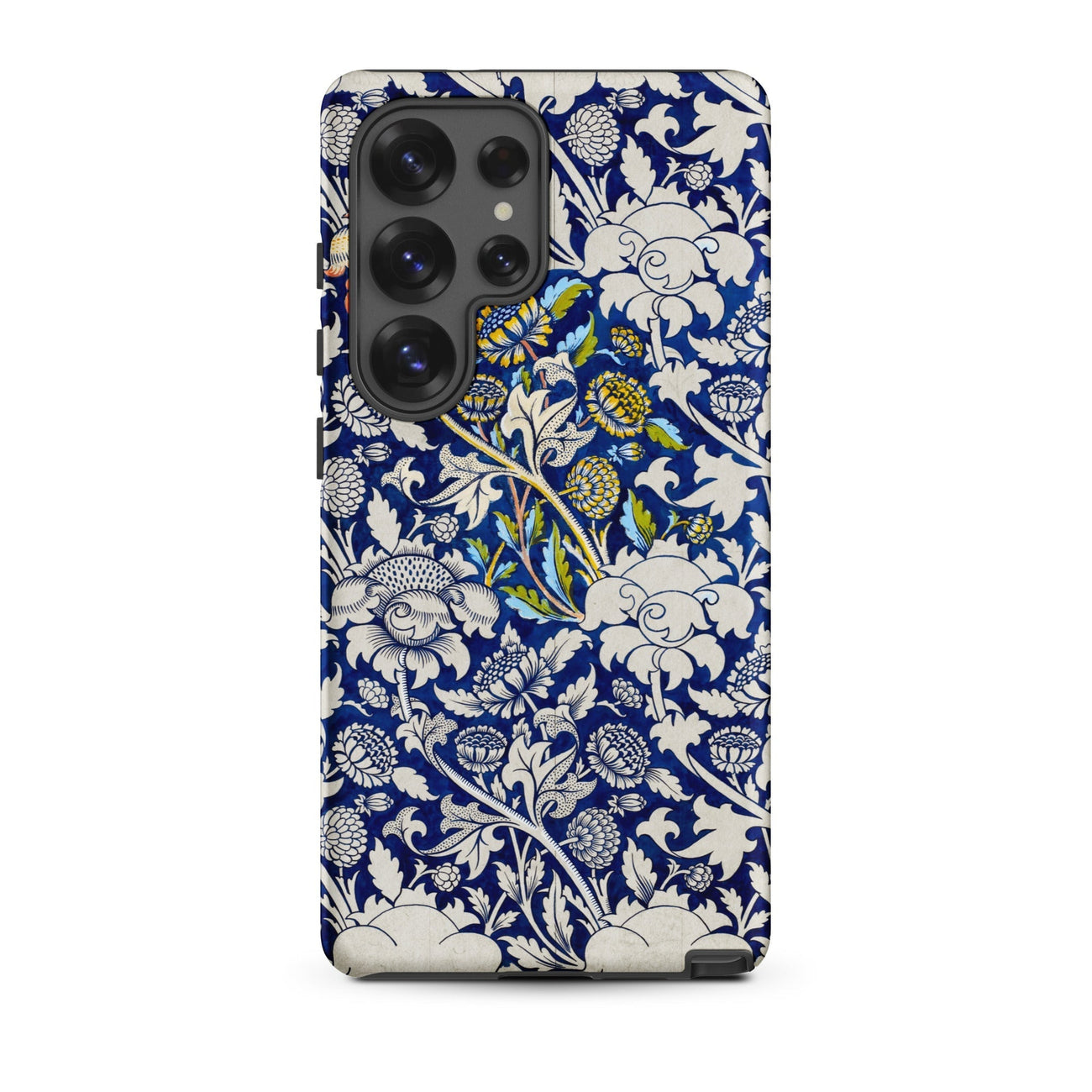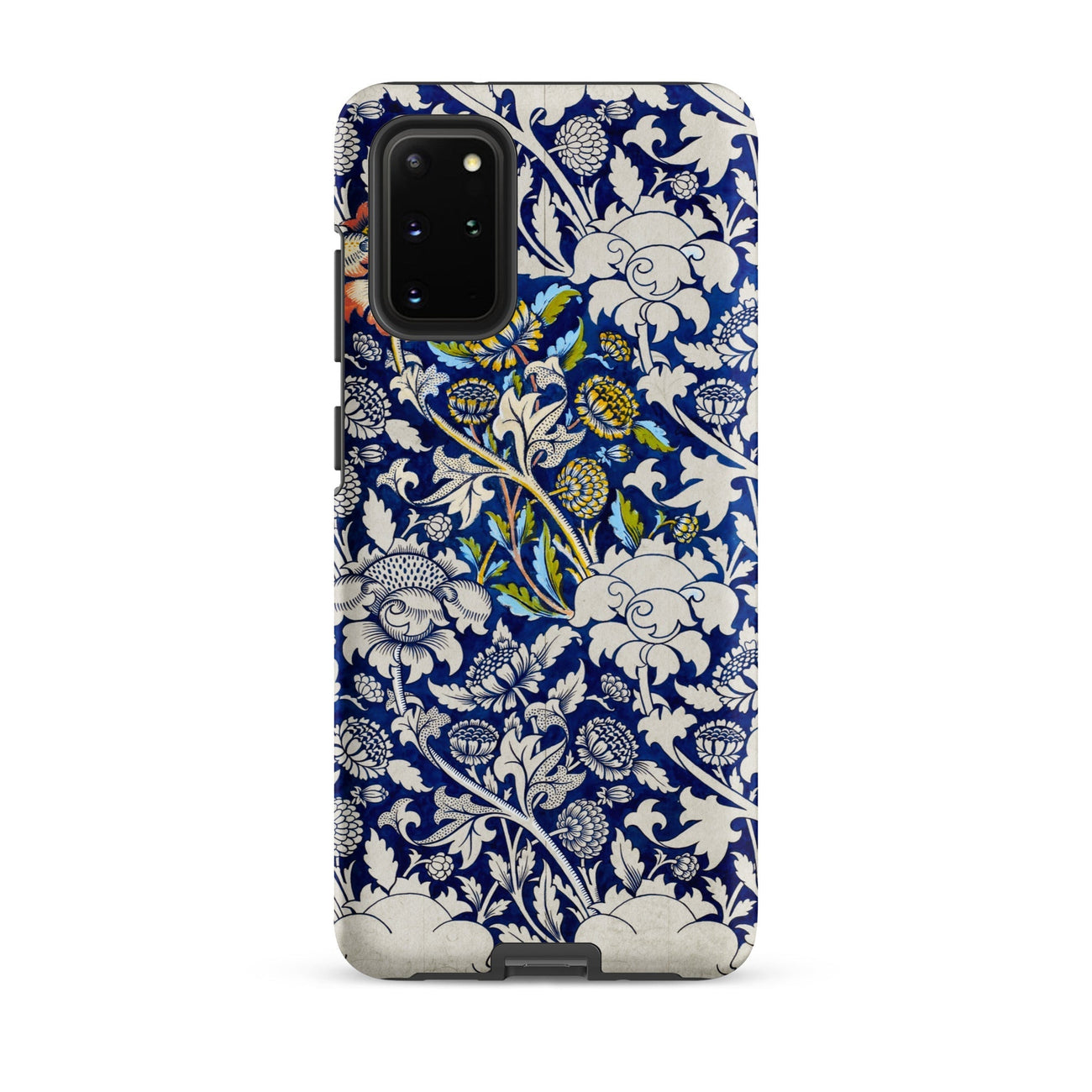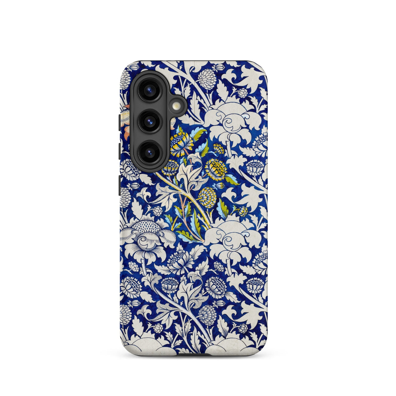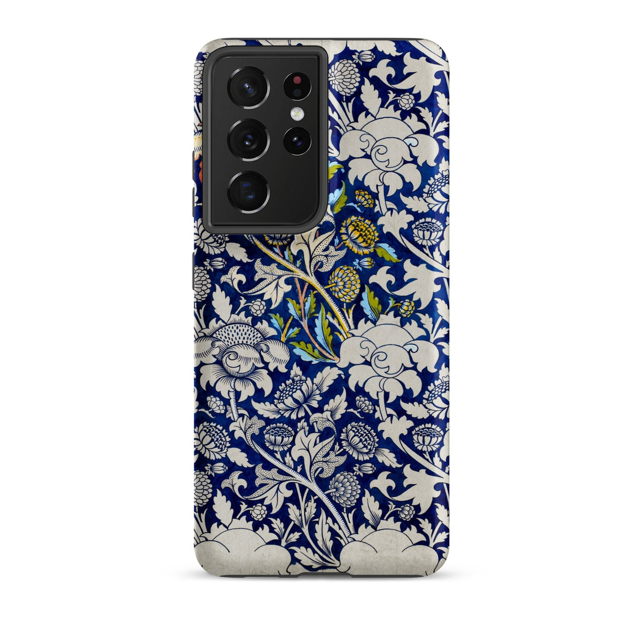 La superficie de esta funda Samsung vibra con tallos entrelazados, sus pálidas flores desplegándose contra un cielo de azul profundo como el océano. Cada hoja, bordeada en azul o verde dorado, parpadea con el recuerdo del pincel de un artesano. Reflejando la devoción de Morris por el jardín salvaje como musa.