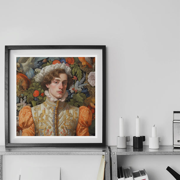 L'âge doré de l'aristocratie queer allemande renaît dans le regard du prince Hugo. Son sourire doux oscille entre défi et invitation. Tandis que son pourpoint brille sous la lumière des bougies. Une opulente broderie de décadence baroque de Weimar, sa filigrane dorée vivante avec l'héraldique de la résistance royale gay. Autour de lui, une émeute d'ornementation florale Rococo. Chaque fleur est un secret murmuré des cours de la Renaissance perdue—se déployant dans un cadre luxuriant et indompté.