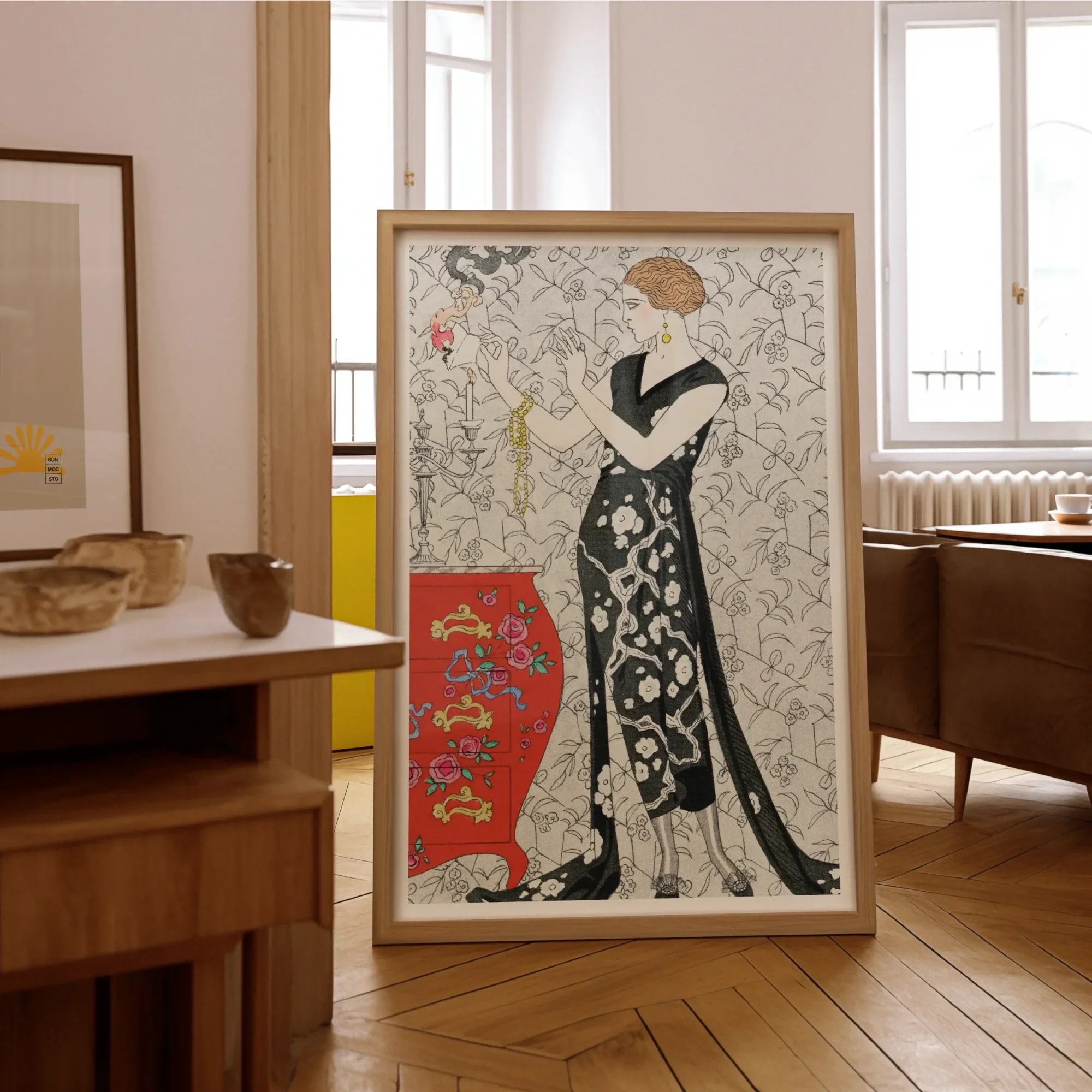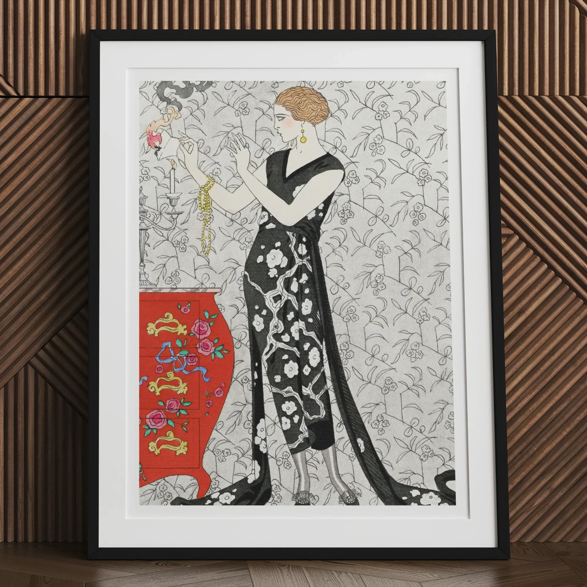 Entrez dans le monde énigmatique de la Haute parisienne des années 1920 couture avec cette impression artistique captivante de Gazette du Bon Ton. Vous serez fasciné par George BarbierIllustration magistrale d'une robe de soirée élégante de De Beer, où East se réunit vers l'ouest dans une symphonie d'élégance art déco. La silhouette allongée du modèle, ornée d'une robe noire fluide ornée de délicats motifs floraux blancs, dégage une sophistication dans une toile de fond de feuillage stylisé.