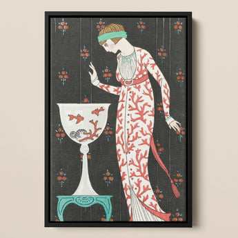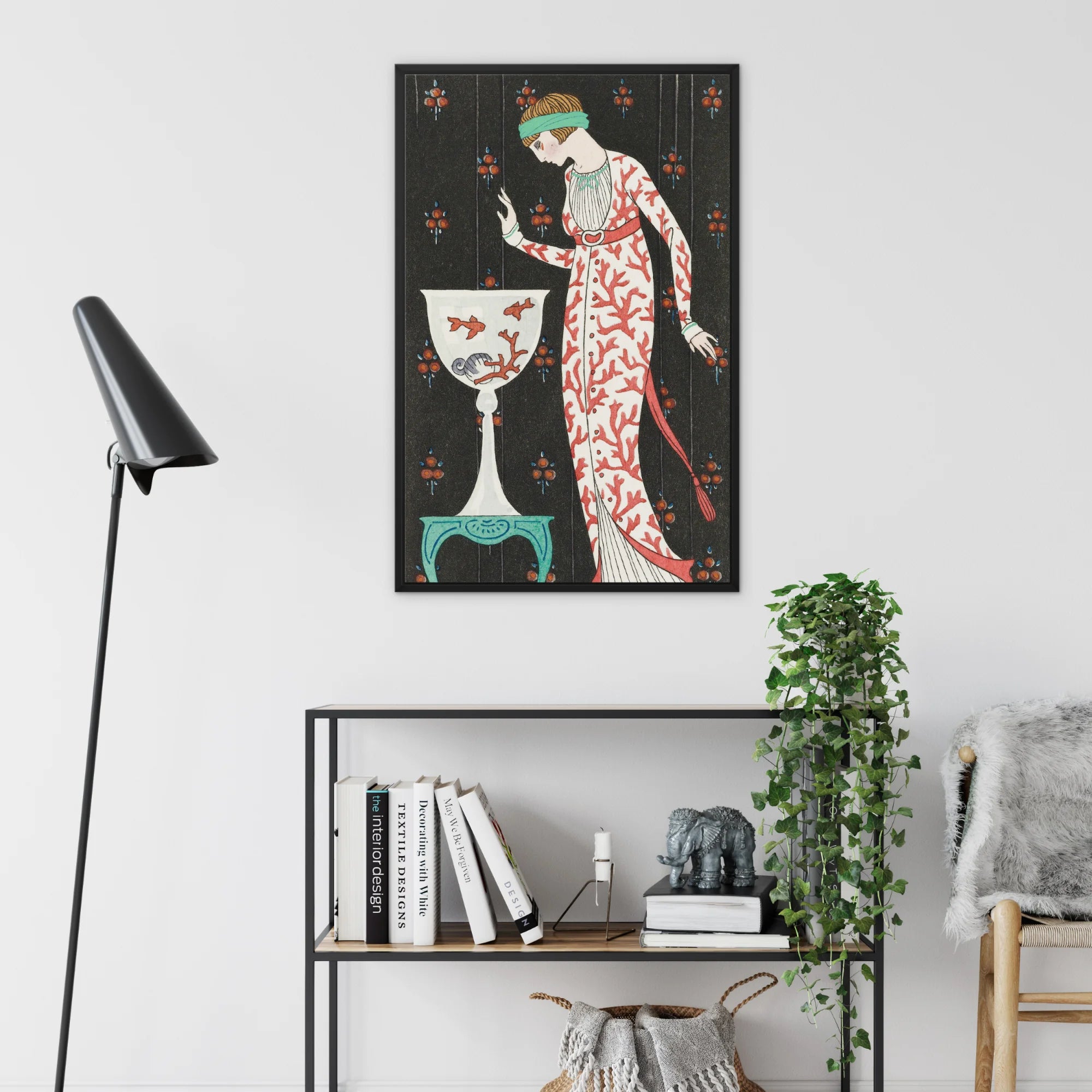 Cette pièce exquise présente le talent inégalé de Barbier pour le mélange Art Nouveau esthétique avec des motifs d'inspiration japonaise. En regardant cette reproduction haute résolution, vous serez captivé par les détails complexes - de la folie fantaisiste dardant à travers les eaux cristallines à la disposition rythmique des baies écarlates ornant la toile de fond.