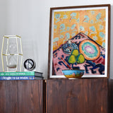 Cet imprimé avant-gardien avant-garde est une fête fauviiste pour les yeux qui vous laisse faim pour plus. Avec des coups de pinceau audacieux de Maurer vous transportant dans une scène culinaire fantaisiste, où le salon Zesty Chartreuse Pears au sommet d'une nappe rose émeute.