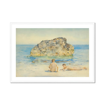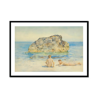 Le pinceau de Tuke déploie l'éclat aigue-marine de la mer et la lueur éphémère de la roche pâle, chaque coup de pinceau étant un hymne à la chaleur fugace de l'été. Les figures, décontractées mais classiques, se fondent dans le bord rocheux, absorbées par le calme des marées. La palette de Tuke s'épanouit avec des bleus subtils et des teintes chair atténuées, capturant le silence en plein air des loisirs ensoleillés.