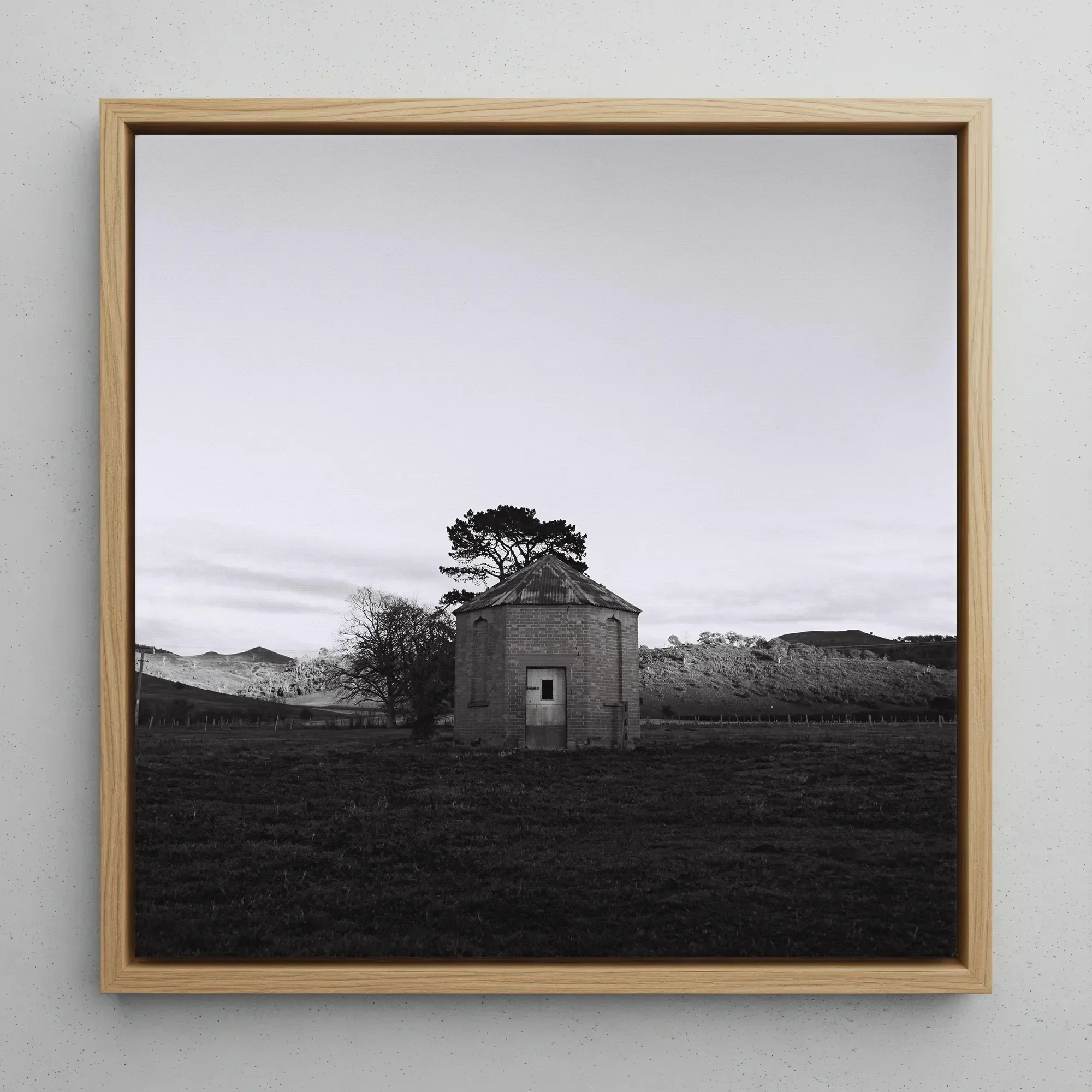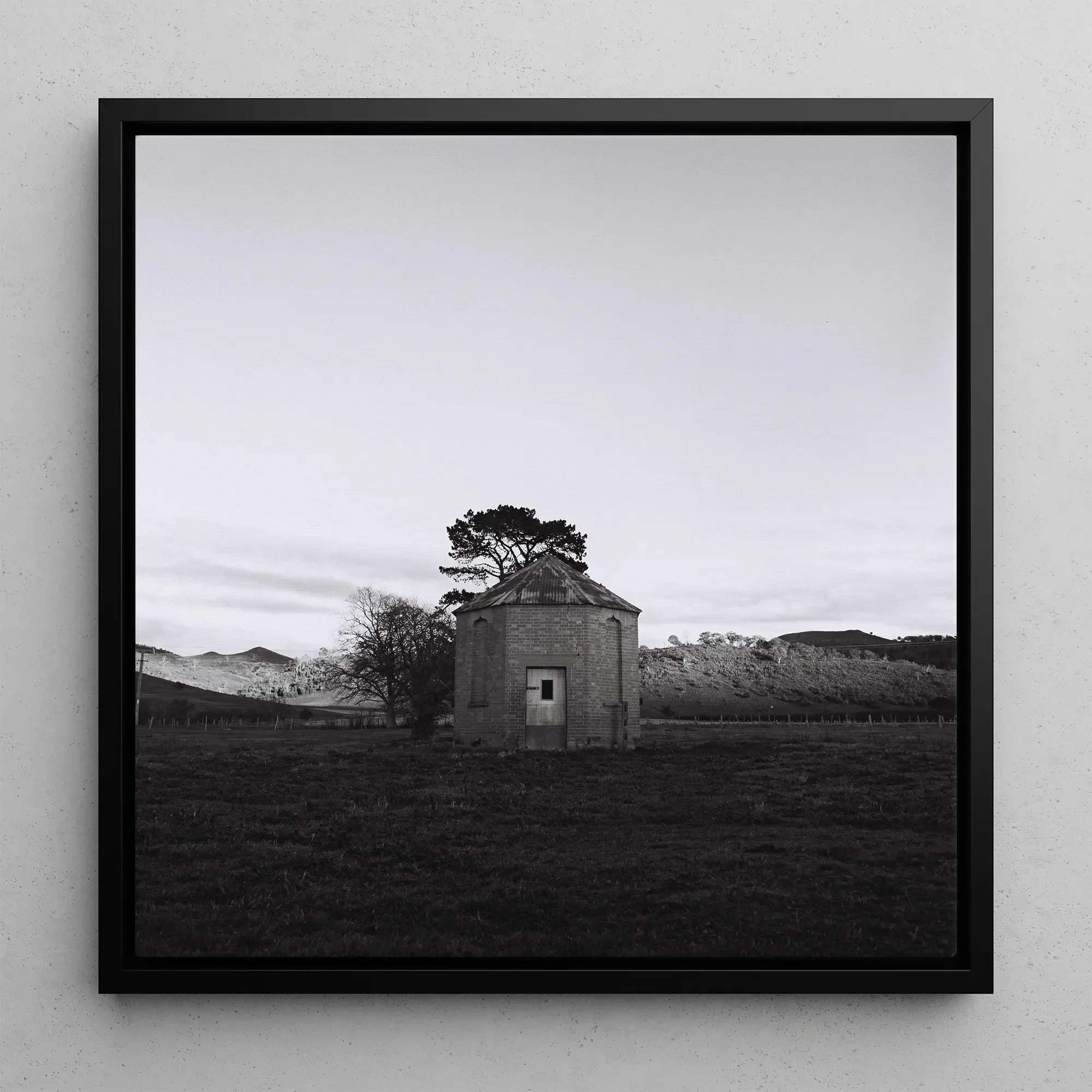Une coque de brique unique s'élève d'un champ dépouillé jusqu'au silence. Ses fenêtres fixent la pâleur lavée du ciel, retenant la douleur du travail et du temps disparus. Chaque joint de mortier enregistre un souffle autrefois dépensé, chaque linteau fissuré un appel sans réponse.