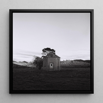 La photographie plie l'architecture dans la mémoire, l'habitation rurale se dissolvant vers l'abstraction. Les tons noirs se déposent comme des cendres sur la ligne du toit, tandis que des vapeurs pâles dérivent à travers un horizon qui a oublié les noms.