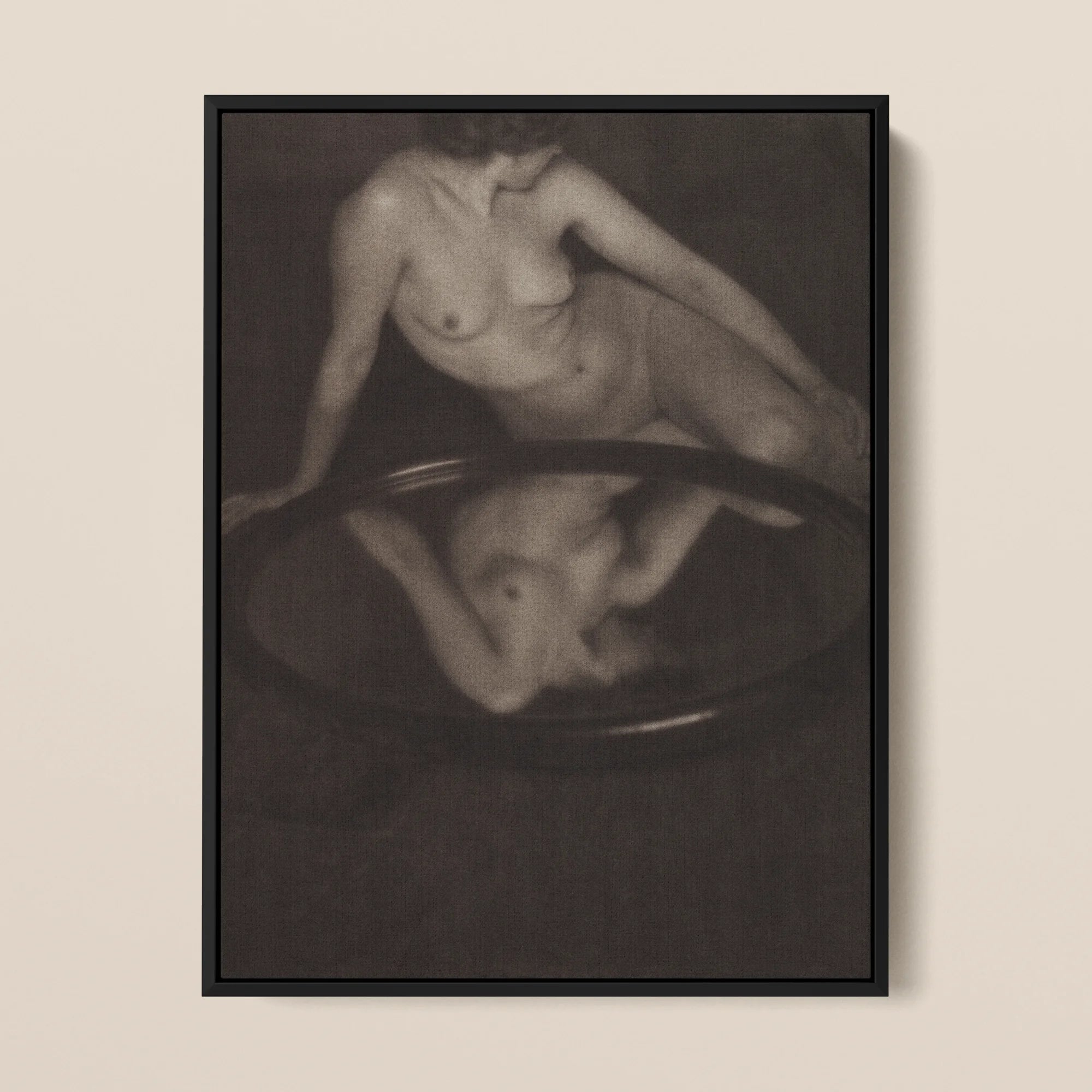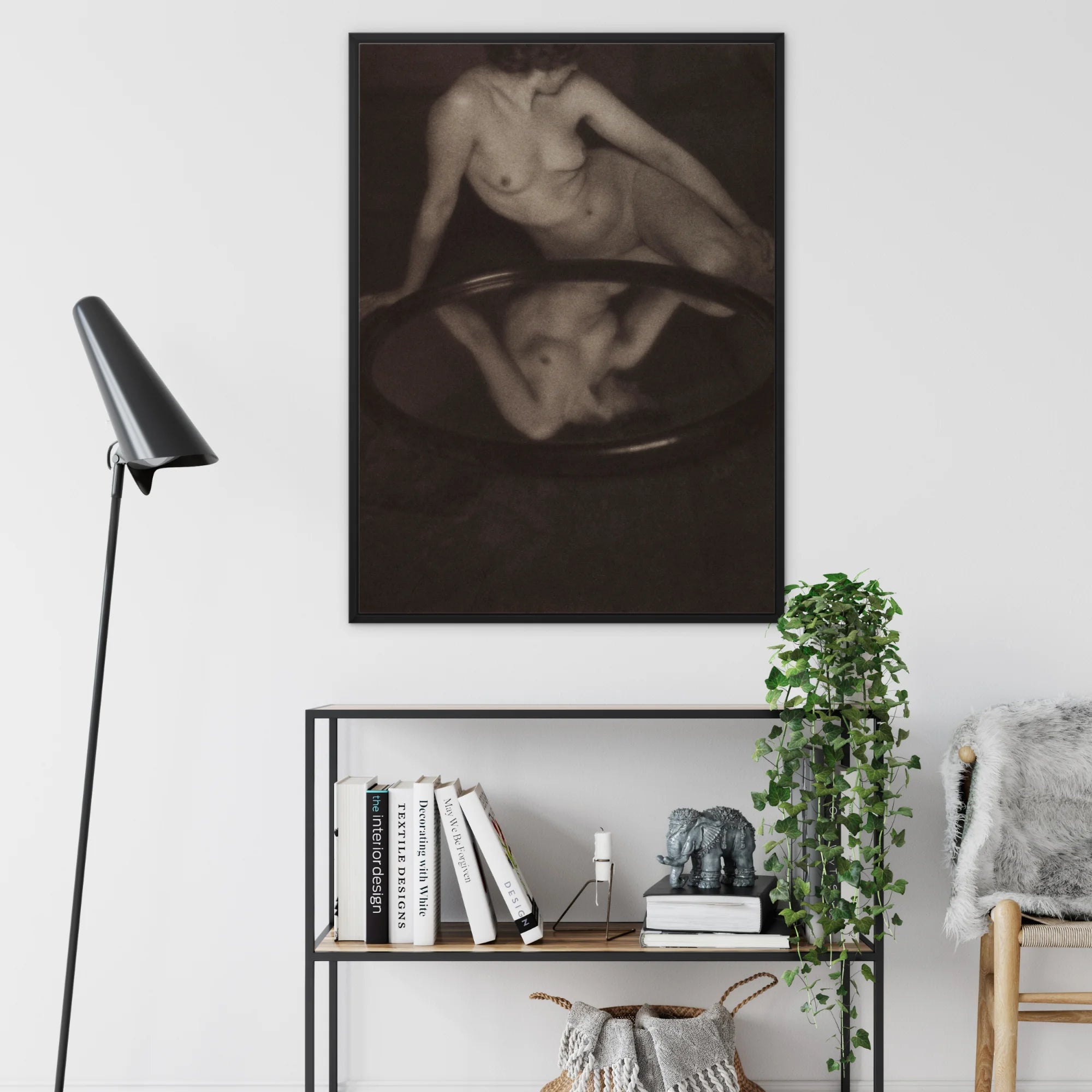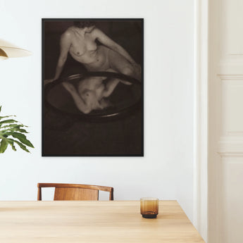 Ce nu obsédant éthéré par Clarence H. White capture l'essence du pictorialiste photographie, vous invitant dans un royaume onirique de concentration douce et de symbolisme évocateur. L'image sépia présente une figure féminine gracieusement cambrée sur un miroir circulaire, sa réflexion créant un écho visuel fascinant. La manipulation magistrale de la lumière et de l'ombre par White accentue les courbes du sujet, tandis que la surface argentée du miroir ajoute une luminescence d'un autre monde.