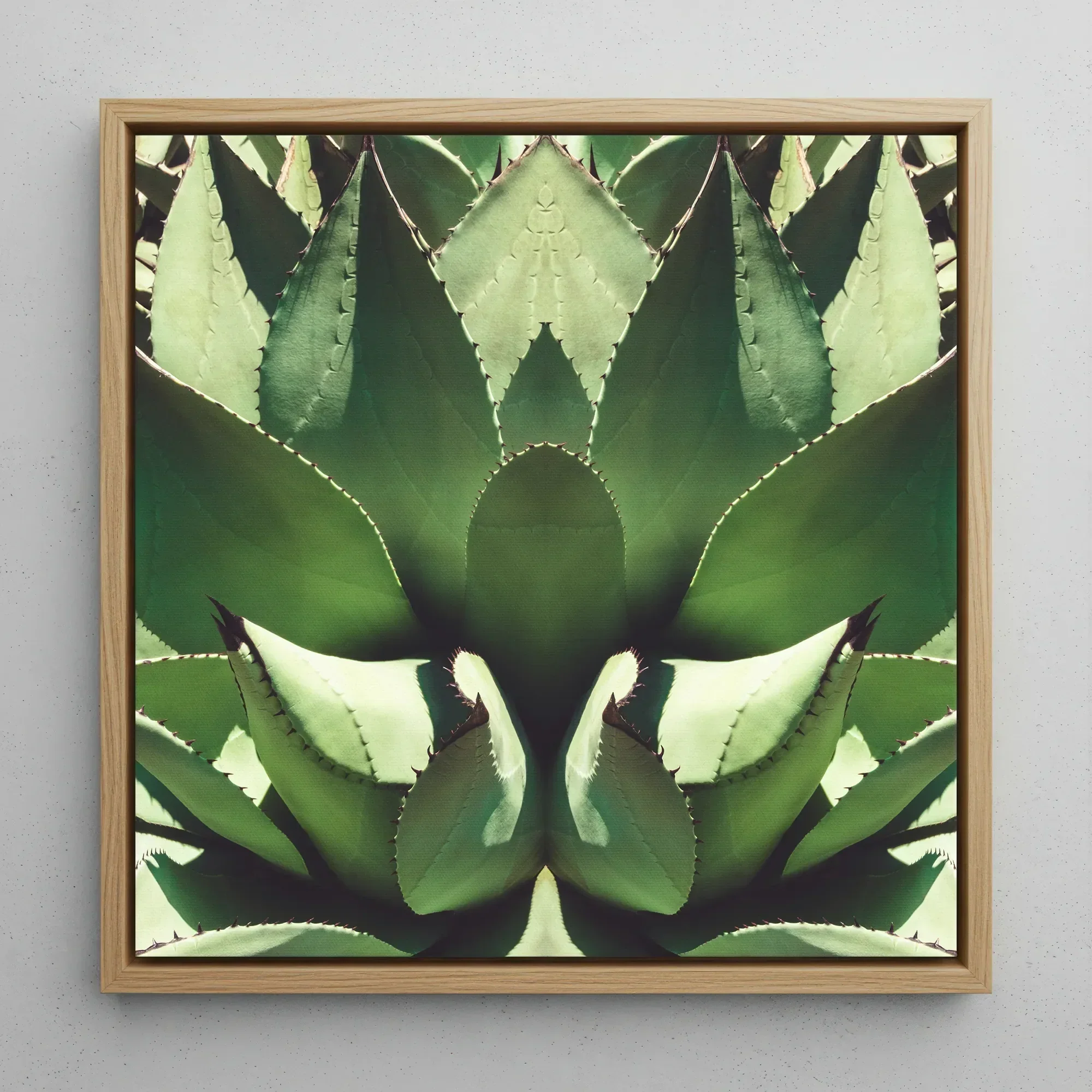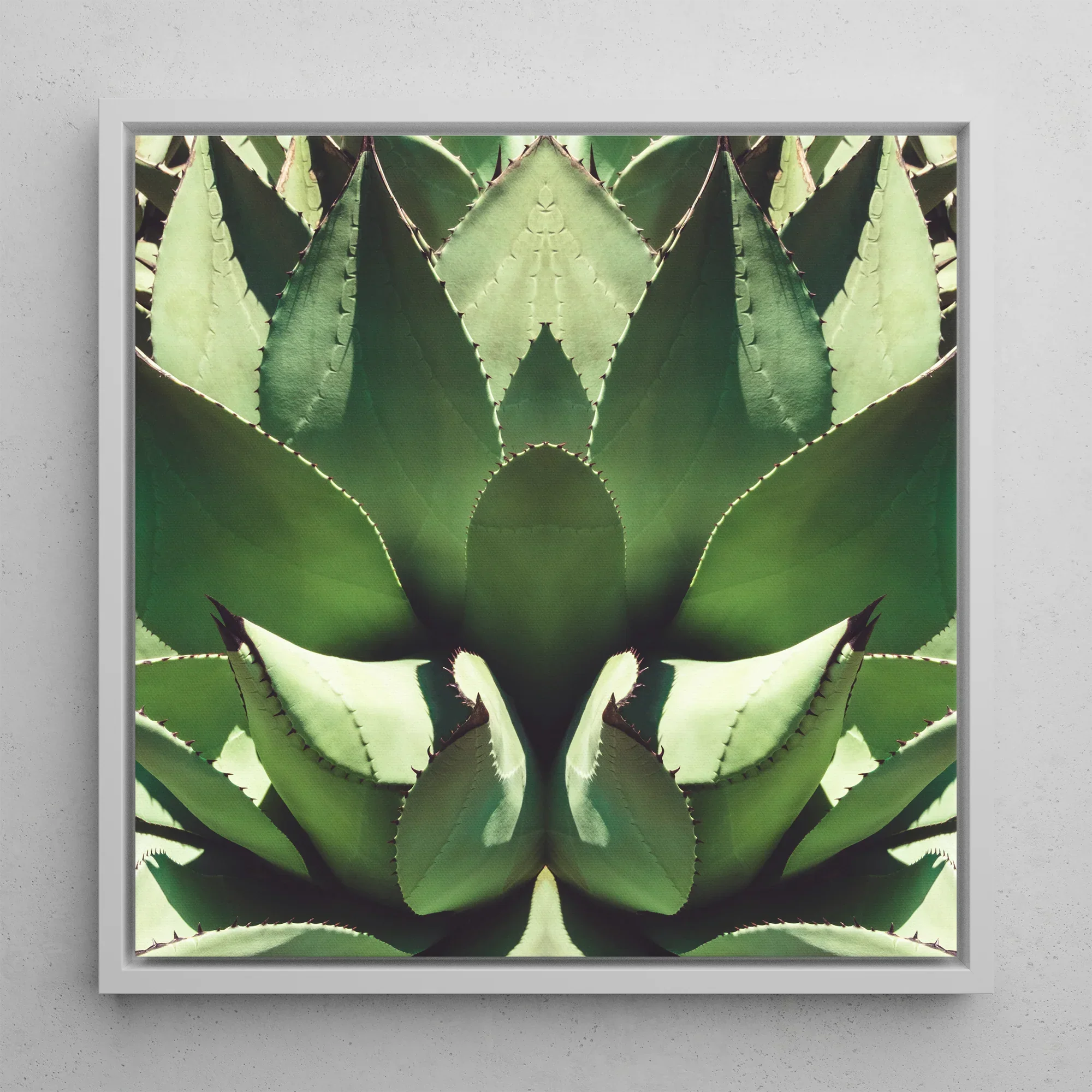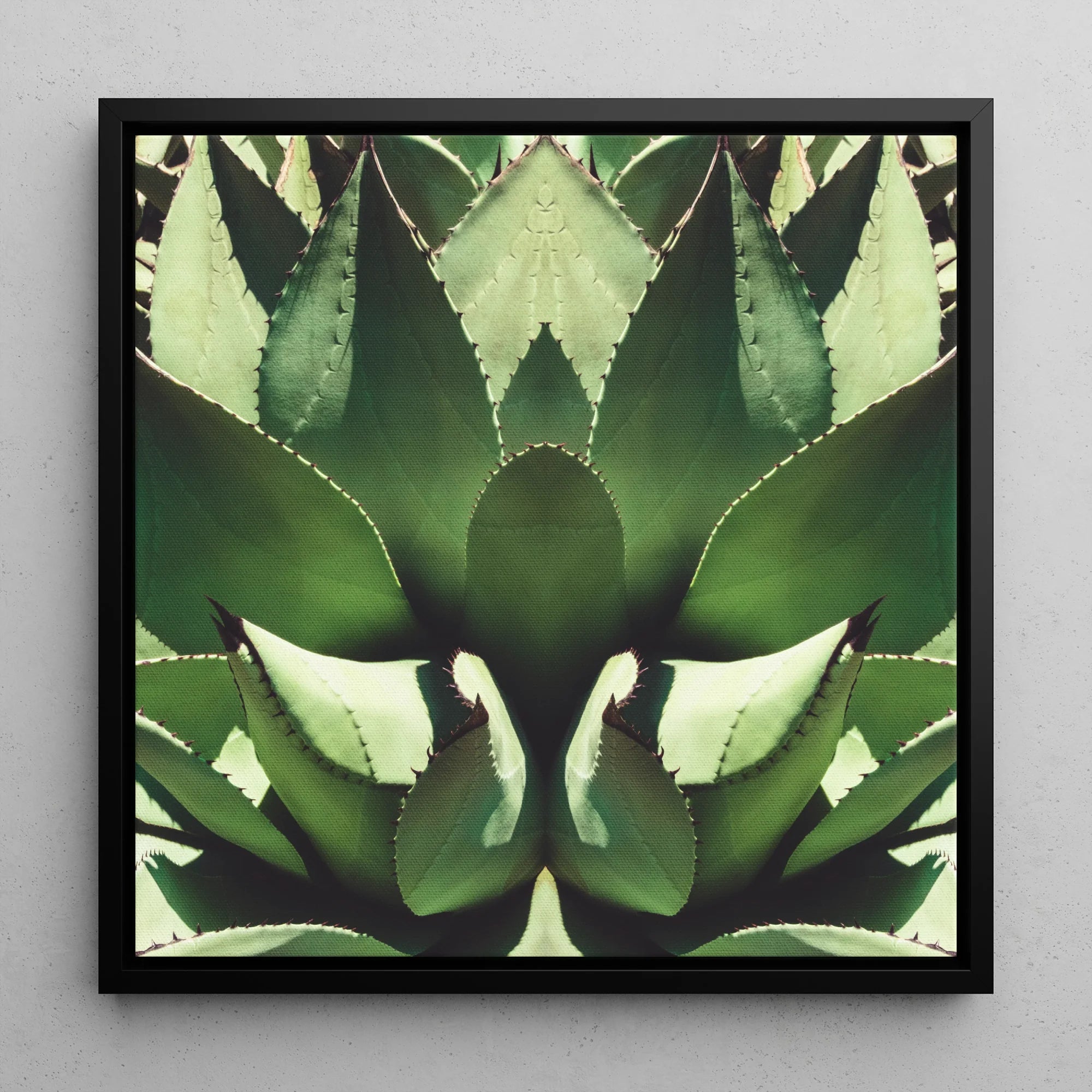 Cette métamorphose d'agave en miroir vous transportera dans un rêve xeriscape, où la symétrie botanique règne en maître. Vous serez témoin de la finesse fractale de la nature élevée à des hauteurs surréalistes dans cette toile encadrée flottante, un témoignage de la majesté discrète de l'agave. La silhouette épineuse de la succulente, doublée et réfléchie, se transforme en un Rorschach aux teintes de jade, défiant les perceptions de la flore et de la forme.