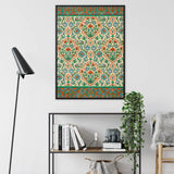 La toile éclate de vie, mettant en valeur une symphonie de lotus azure et des œillets de vermillon dansant à travers un champ d'ivoire. Les vignes émeraude tissent des arabesques complexes, symbolisant la nature infinie de la création divine. Et les frontières vibrantes, rappelant les manuscrits coraniques illuminés, encadrent ce paradis botanique.