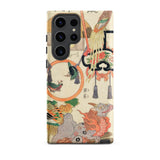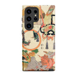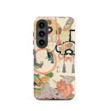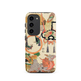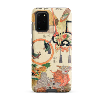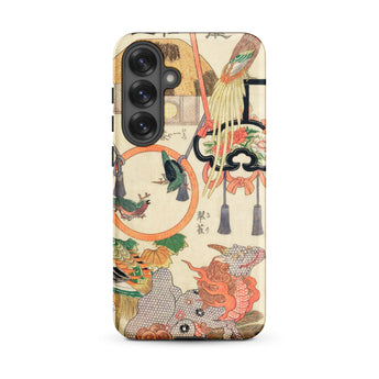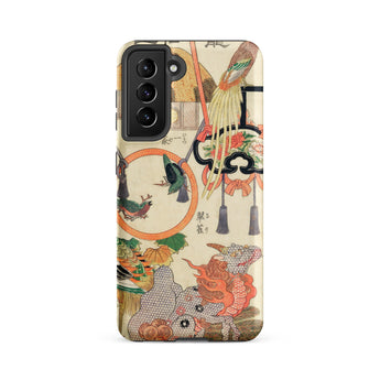 Sur cet étui Samsung, l'illustration de vannerie d'Ichida Shoshichiro de Naniwa scintille avec l'élégance de la période Edo. Des motifs de tissage complexes se déploient à travers des plumes de phénix, des ornements en anneaux, des glands et du feuillage, où des créatures mythiques se heurtent à des formes décoratives.