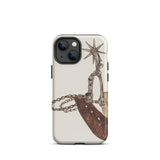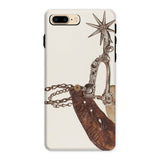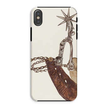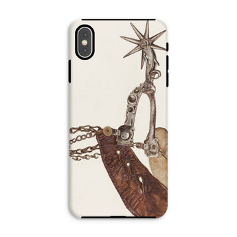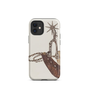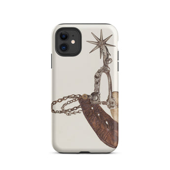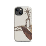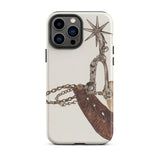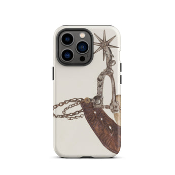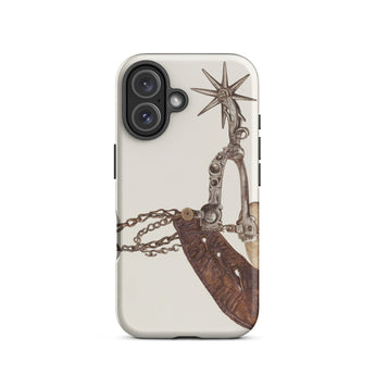 Grit, poussière, et le cliquetis des éperons—cette coque iPhone porte le poids de mille miles indomptés. L'œuvre d'art complexe de Vera Van Voris transforme l'humble éperon de cowboy en un artefact de l'esprit brut de la frontière. La sangle en cuir usée, plissée comme une terre desséchée sous un soleil de désert, s'enroule autour de l'acier poli, sa molette en forme d'étoile prête à servir de boussole pointant vers l'ouest. Chaque maillon de chaîne, chaque rivet patiné, murmure des convois de bétail au clair de lune et des talons de bottes frappant les planchers en bois des saloons.