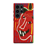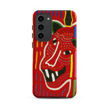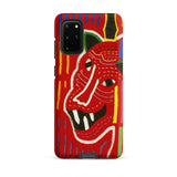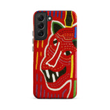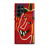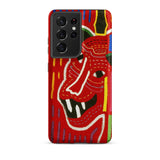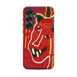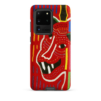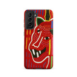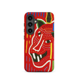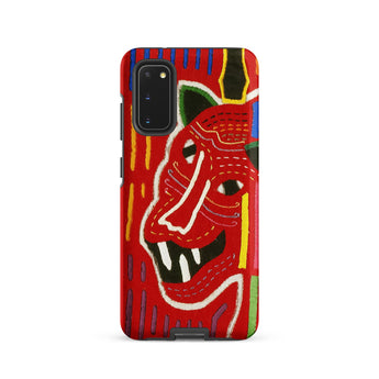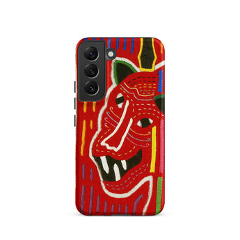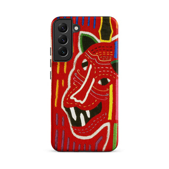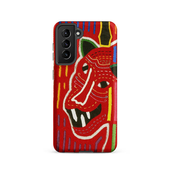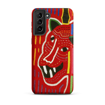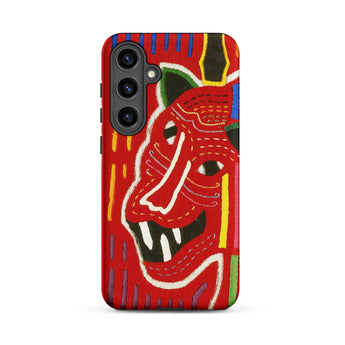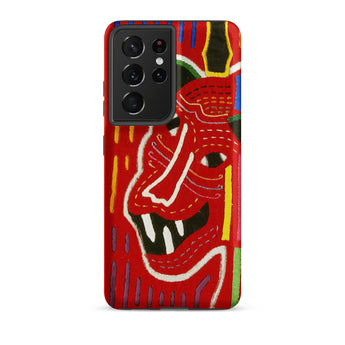 Chaque contour—éclat jaune, trait violet, arc émeraude—suit les couches découpées à la main de la broderie traditionnelle Mola, née dans les îles San Blas du Panama. Cette coque Samsung protectrice transporte ce langage textile séculaire dans le présent électrique, son motif vibrant d'esprit animal cérémoniel, de canopée de jungle côtière et de vitalité de masque de festival.
