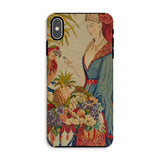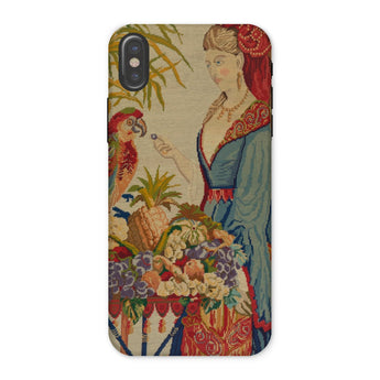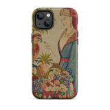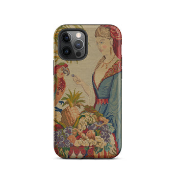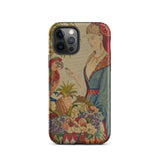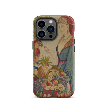 La déesse brodée ne fait pas défiler. Elle nourrit. Elle contemple. Elle s'épanouit à côté d'une corne d'abondance d'art de tapisserie victorienne, de fruits botaniques en point de croix, et d'appétit baroque. Anachronisme ? Définitivement. Mais aussi un défi : et si votre coque d'iPhone textile pouvait voyager dans le temps ?