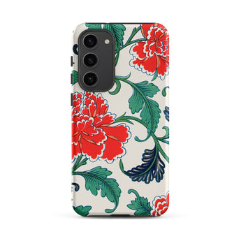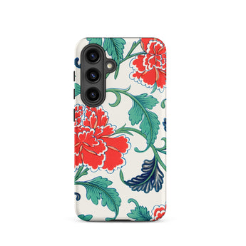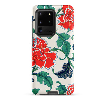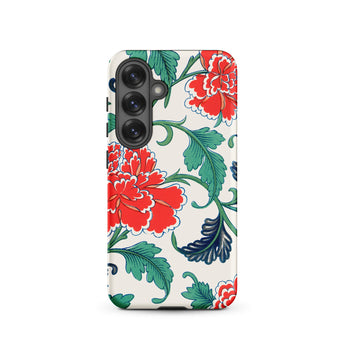 Cette coque Samsung porte l'héritage des arts décoratifs victoriens, s'inspirant de l'illustration botanique, des volutes de Chinoiserie et de la précision de la chromolithographie. Des fleurs de pivoines luxuriantes, bordées d'ivoire, s'élèvent de feuilles d'émeraude veinées de bleu nuit, évoquant les motifs textiles orientaux et la géométrie des carreaux d'Iznik.