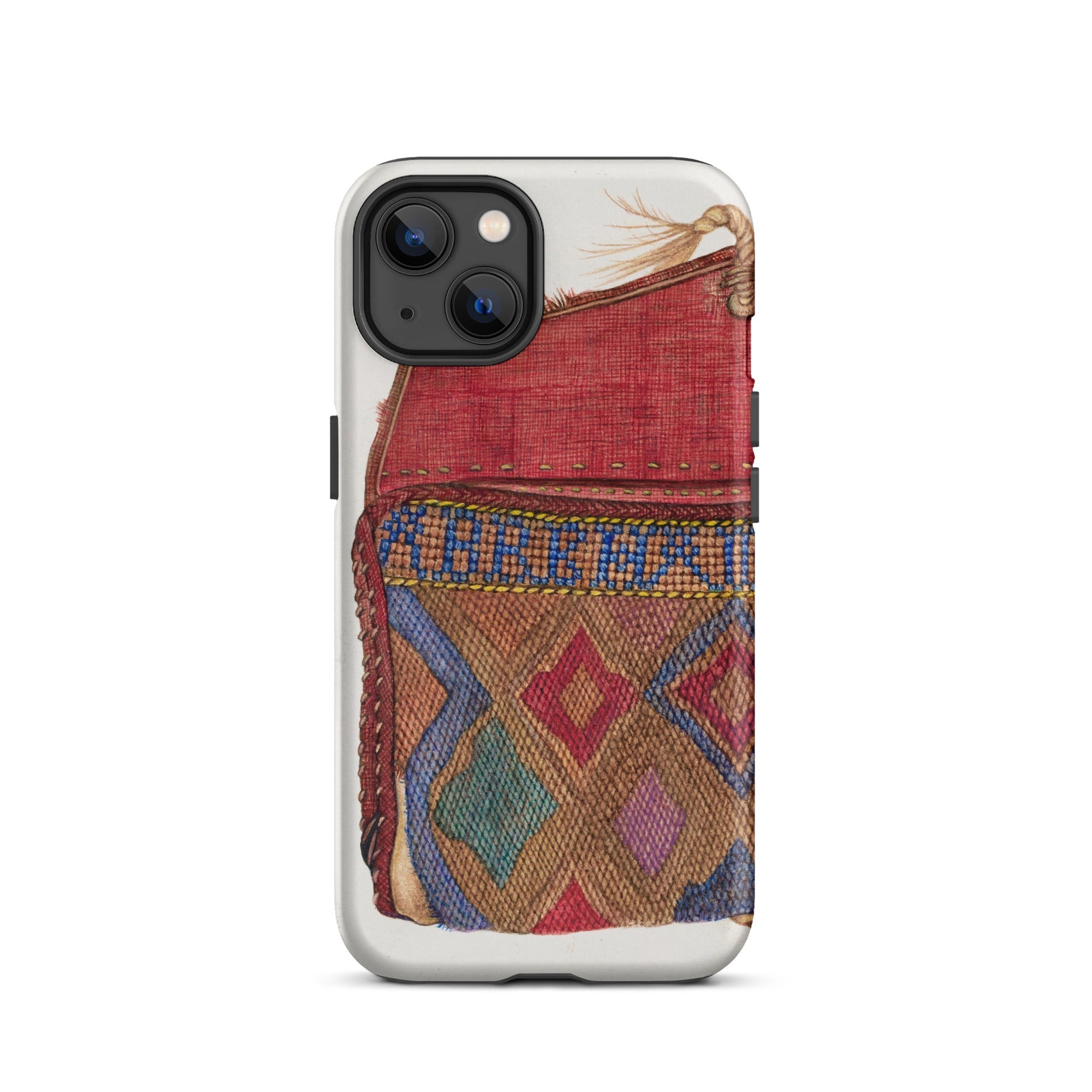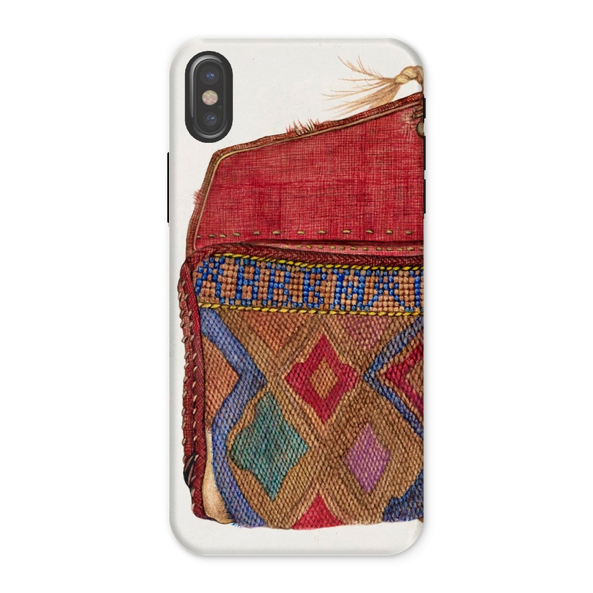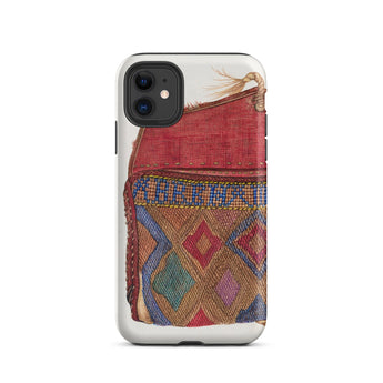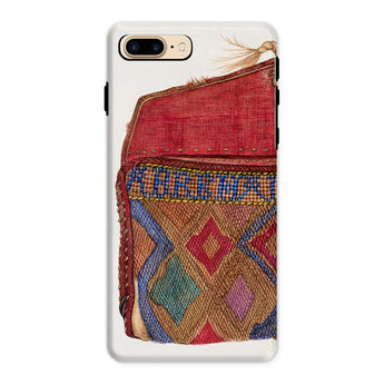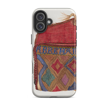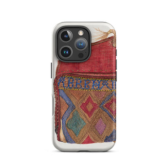 Le design du porte-monnaie, orné de motifs géométriques complexes, reflète les traditions de perlage des artisans autochtones, mêlant héritage et haute couture. Un rabat cramoisi, usé mais audacieux, murmure des mains bien voyagées, des lettres rangées, des secrets pliés dans le tissu. Où chaque point devient une marque de la débrouillardise de l'ère de la Dépression. Chaque fil une histoire d'art contre l'adversité. Ce n'est pas juste une coque de téléphone de mode vintage; c'est une relique de l'élégance du vieux monde, imprégnée des textures de voyages nomades et de passés chargés d'histoires.
