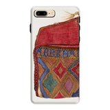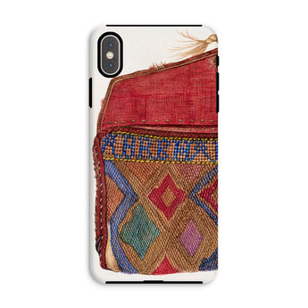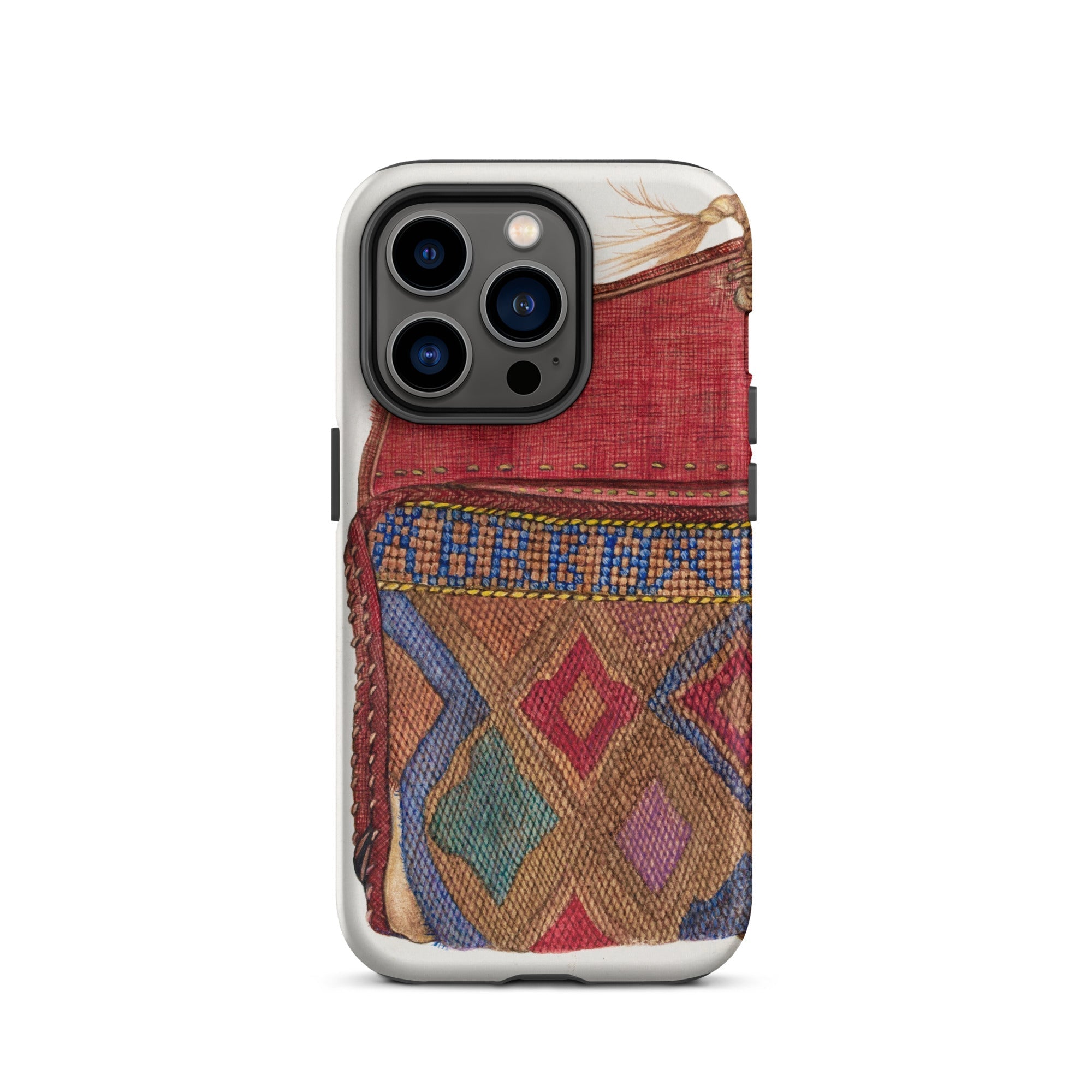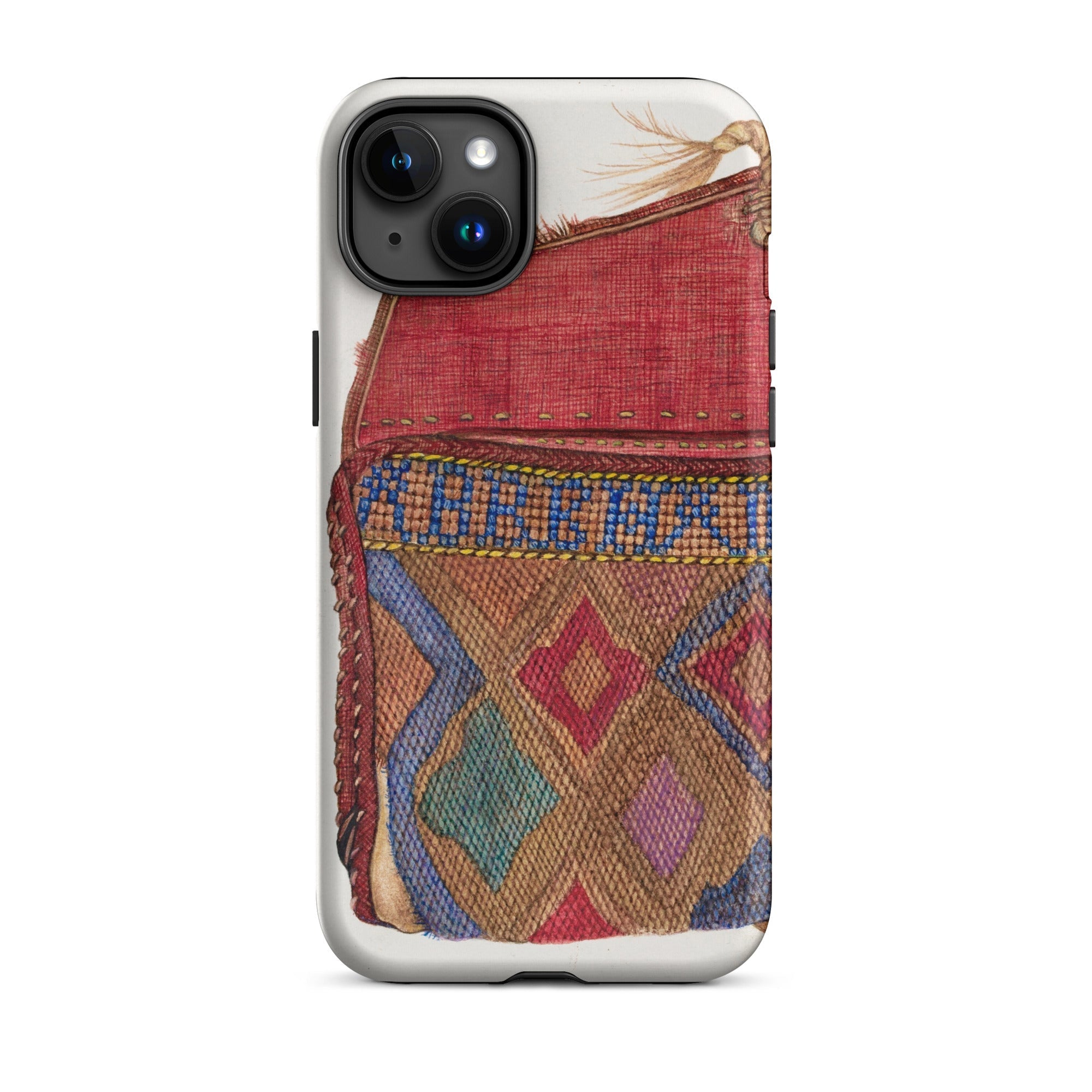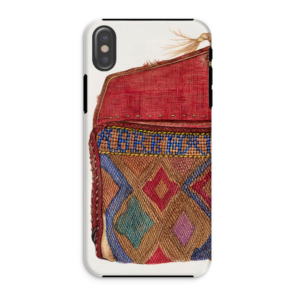 Le design du porte-monnaie, orné de motifs géométriques complexes, reflète les traditions de perlage des artisans autochtones, mêlant héritage et haute couture. Un rabat cramoisi, usé mais audacieux, murmure des mains bien voyagées, des lettres rangées, des secrets pliés dans le tissu. Où chaque point devient une marque de la débrouillardise de l'ère de la Dépression. Chaque fil une histoire d'art contre l'adversité. Ce n'est pas juste une coque de téléphone de mode vintage; c'est une relique de l'élégance du vieux monde, imprégnée des textures de voyages nomades et de passés chargés d'histoires.