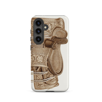 Cette coque Samsung transforme une gravure d'archives en un artefact portable de la culture équestre—fabrication de selles occidentales, travail de bride, design de harnachement victorien. Des lignes fines portent le grain du cuir usé, la tresse de la rêne, la symétrie mesurée de l'art du sellier.