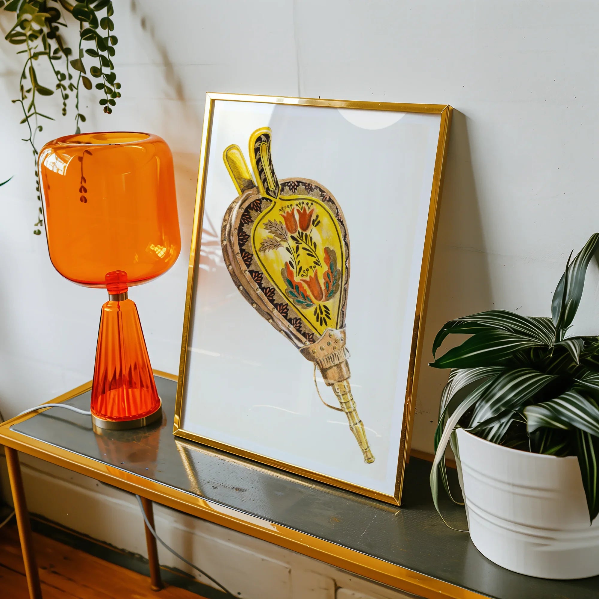 Ce n'est pas seulement un accessoire de cheminée - c'est un témoignage dynamique de l'art folk des années 30. Regardez le cuir jaune ensoleillé, orné d'un bouquet de tulipes ardents et de feuillage verdoyant. La buse en laiton brouvée brille, faisant allusion aux histoires de foyers crépitants et de soirées confortables.