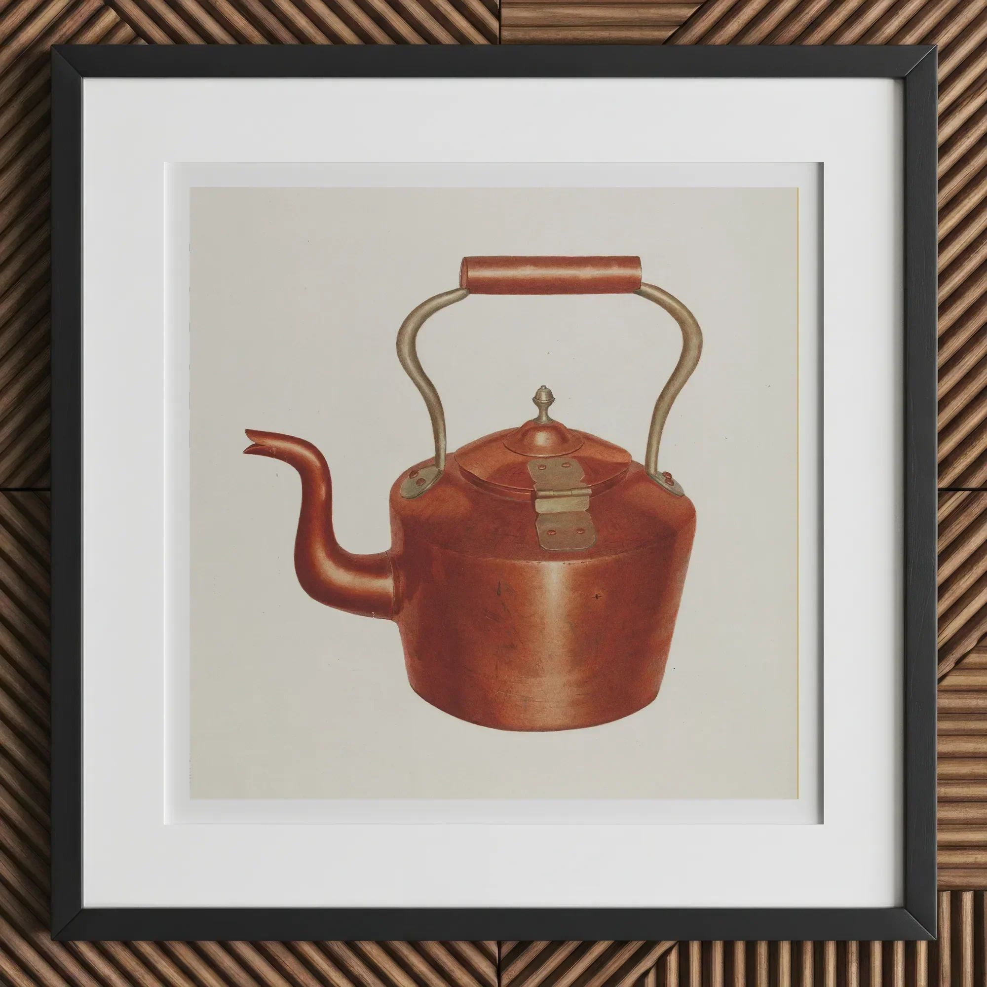 Treat-vous dans la beauté brunie de la cuisine des années 30 d'Edward L. Loper imprimé art. Cette bouilloire en cuivre sera bientôt le cœur du foyer de votre maison. Vous vous perdrez dans la patine brillante de la bouilloire, une symphonie de tons d'Ume et de Sienna chuchotant des histoires d'innombrables bières. Le corps rond du navire brille de promesse, son bec incurvé prêt à verser du confort liquide.