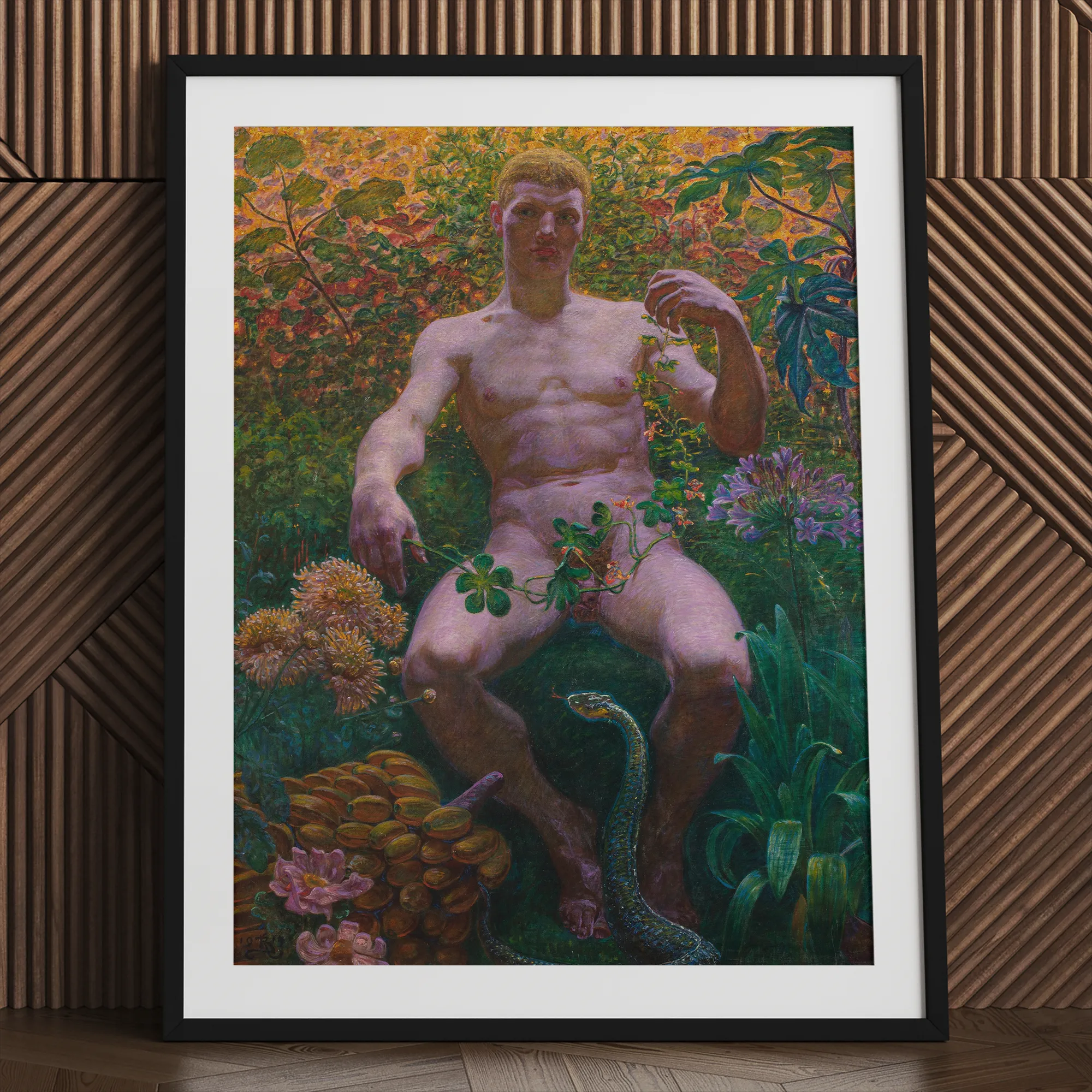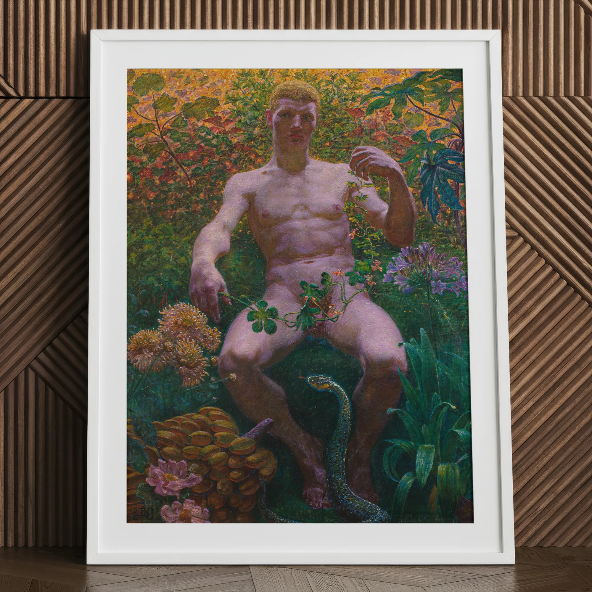 Adam au Paradis fait exploser la Genèse avec un regard wagnérien et la patience pelvienne d'un satyre de marbre réanimé dans la chaleur tropicale. Il n'y a pas d'innocence perdue ici. C'est une bouchée effrénée de décadence nordique enveloppée dans une humidité lisse. Une horticulture érotique où le nu masculin se perche non pas avec honte mais avec une carnation souveraine.